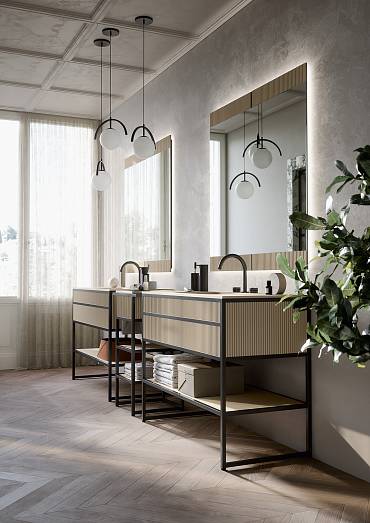Материал: Отделка тумбы — металл matt black, корпус — ew 001 ribbed walnut, столешница — пурефил с интегрированной раковиной, цвет — matt black m556