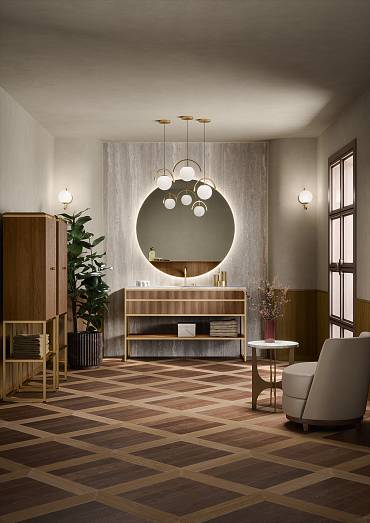 Материал: Зеркало Arco с полкой и посветкой. Отделка орех и металл-сатинировааное золото.