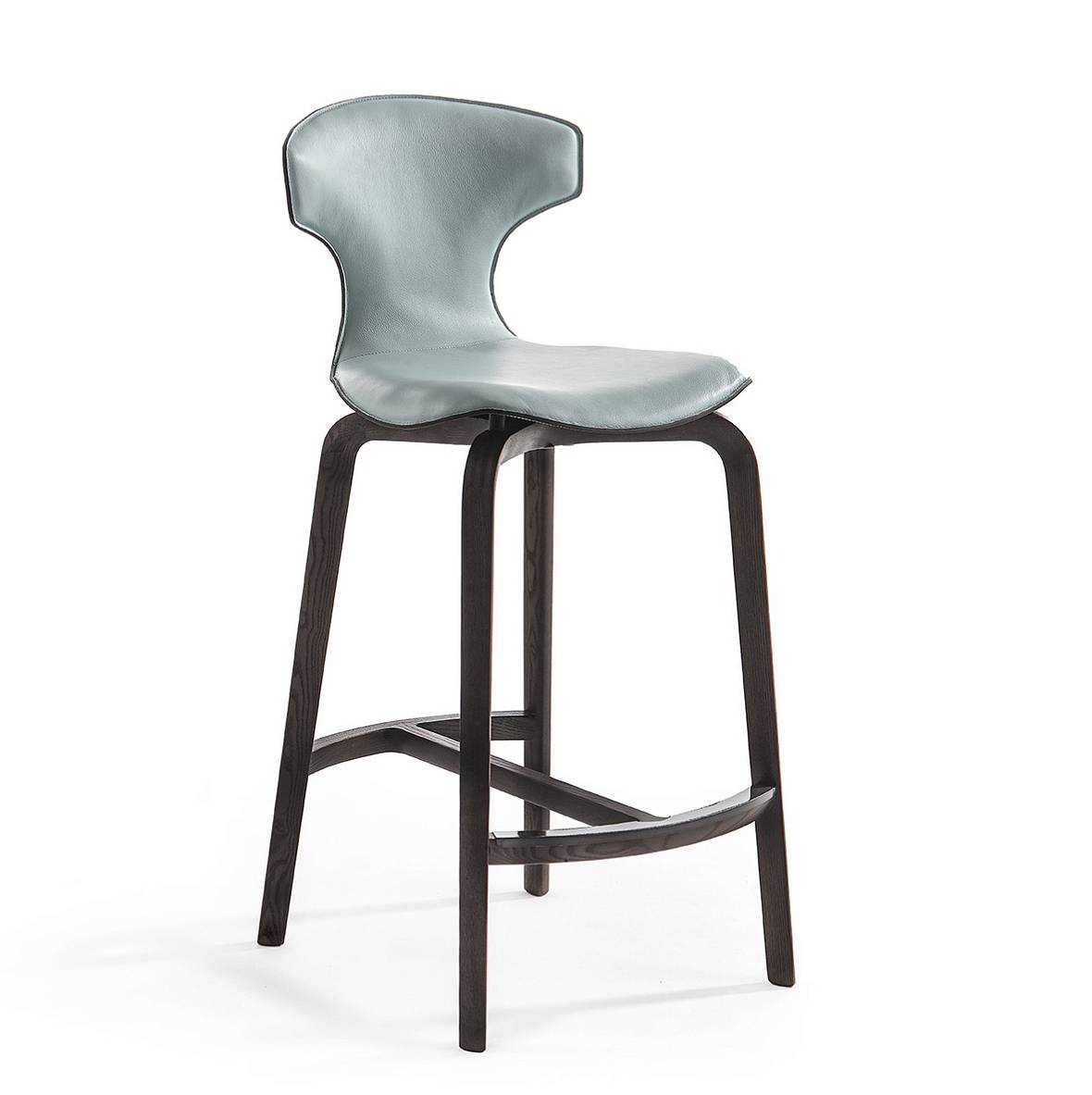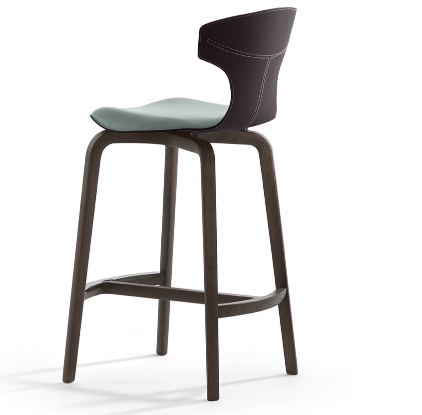 Сиденье в коже Pelle Frau SC двух цветов. Внутренняя часть в коже SC 274 Fresco Blue, наружная часть – SC 28 Seppia. Ножки – ясень в цвете венге.