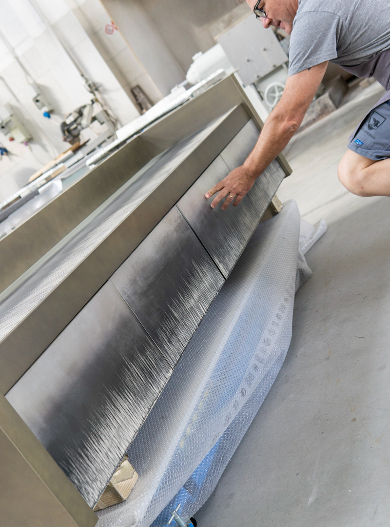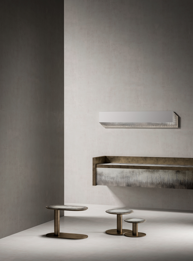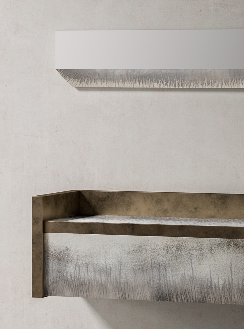 Подвесной комод с четырьмя выдвижными ящиками с механизмом push-pull. Каркас из шпонированного многослойного дерева скрыт под благородным покрытием «состаренная латунь». Фасады — матированное стекло толщиной 6 мм с идеально полированными гранями и изящной гравировкой алмазным кругом. С обратной стороны нанесено серебрение с плавным переходом от выраженного эффекта старины к легкому старению.