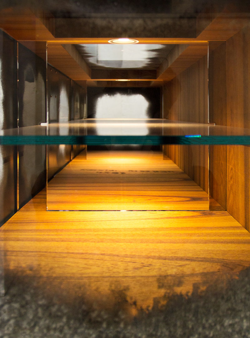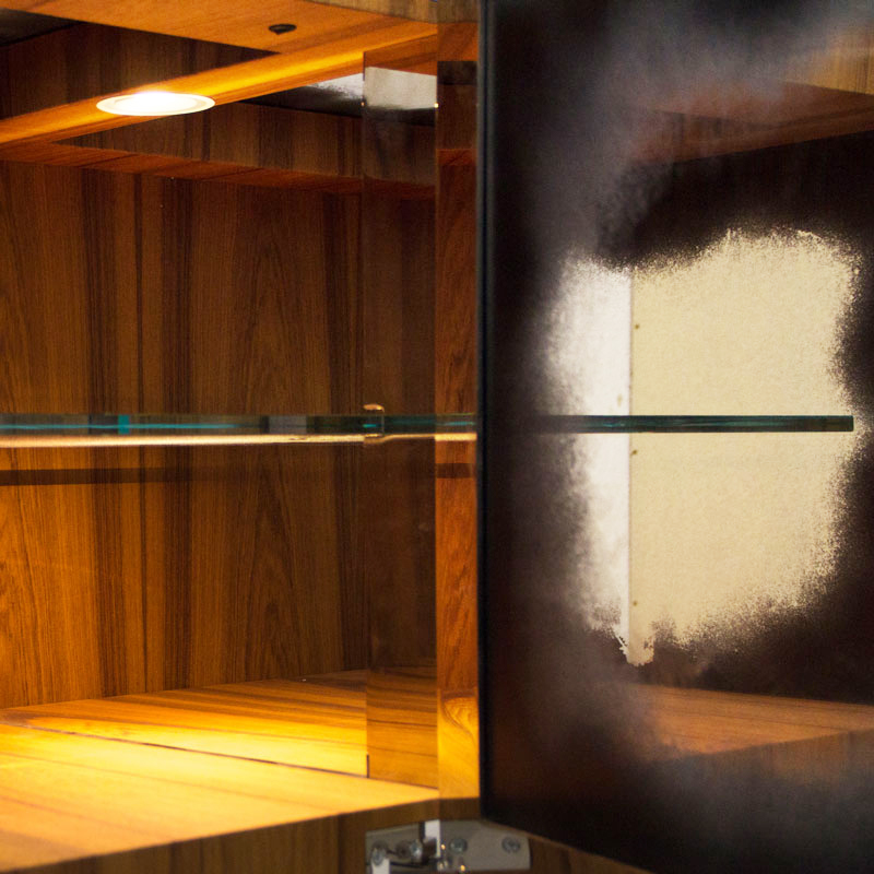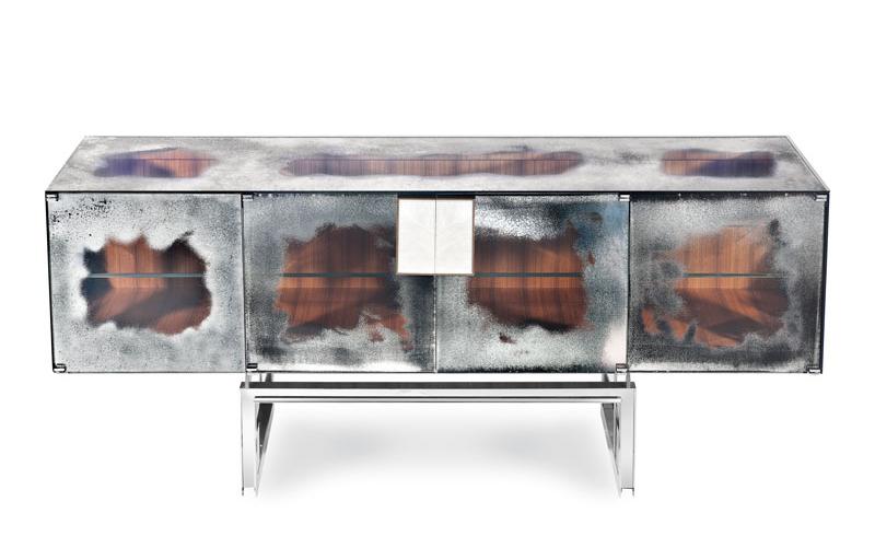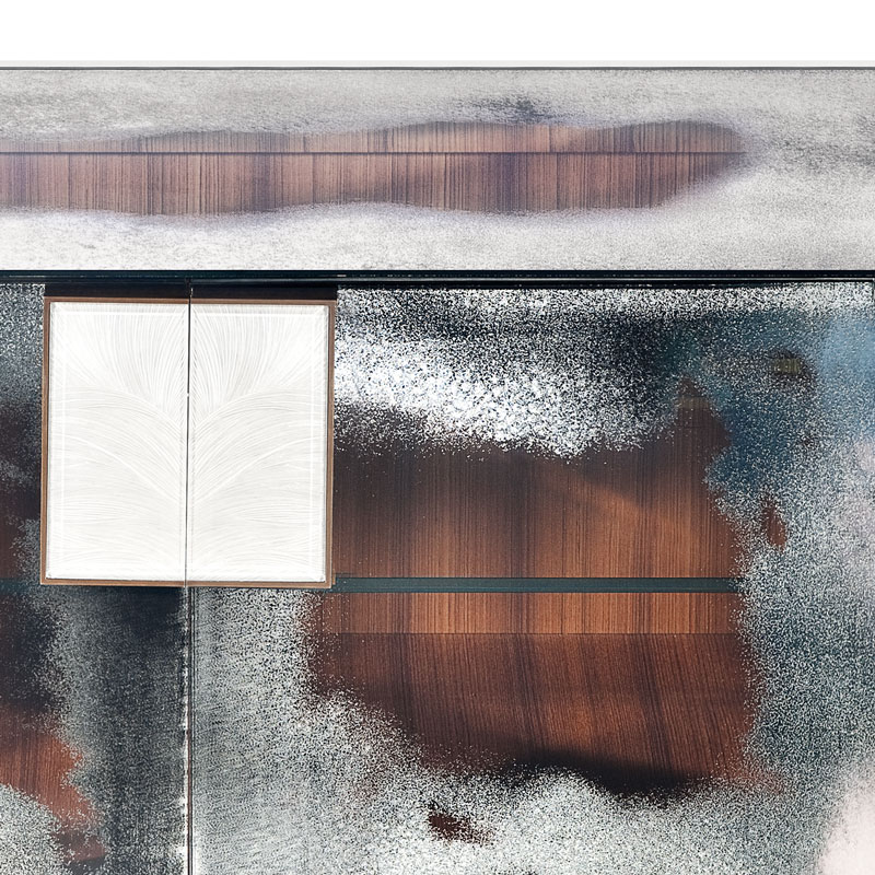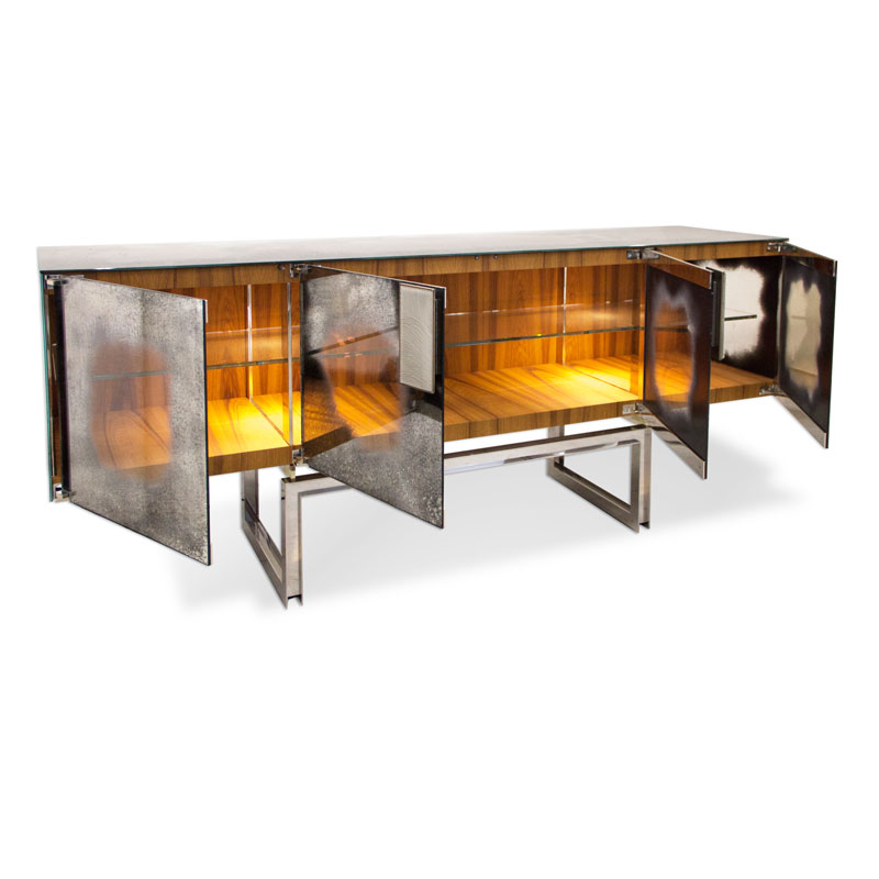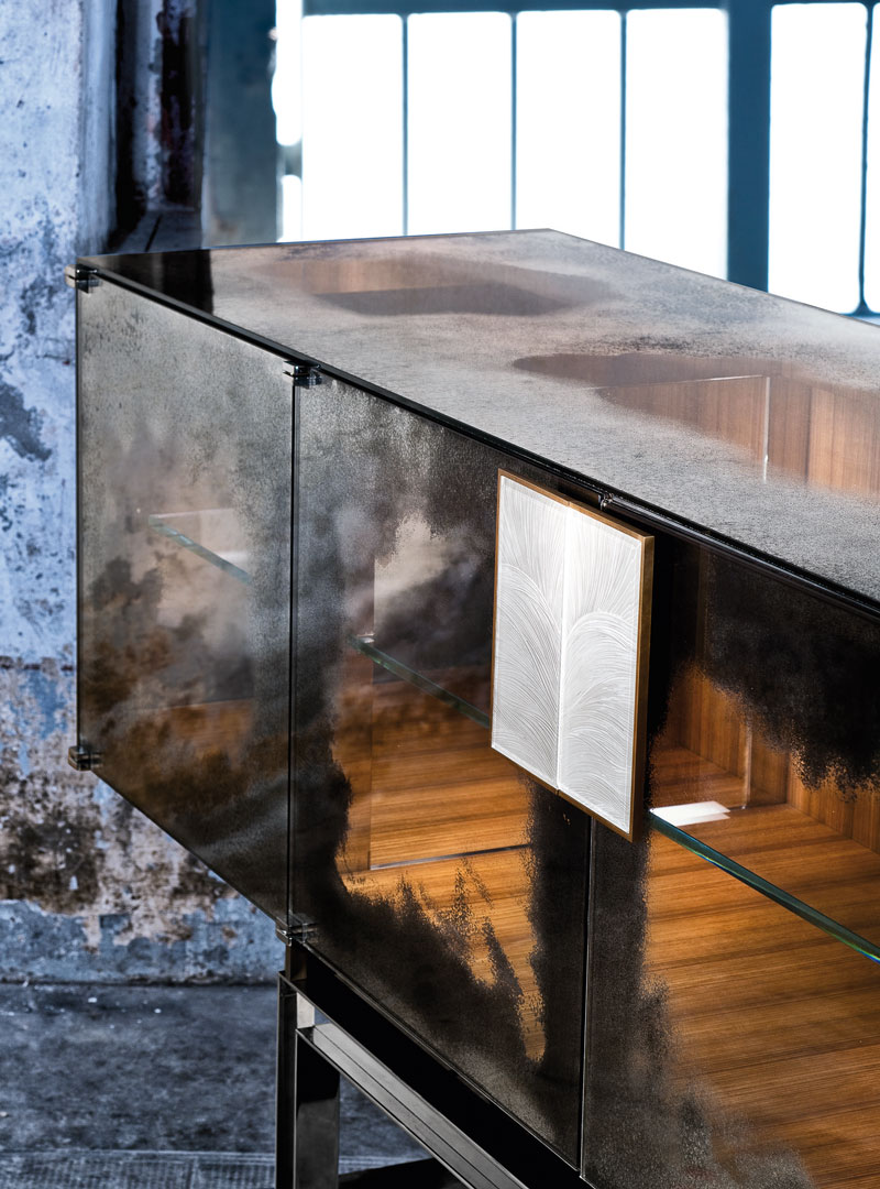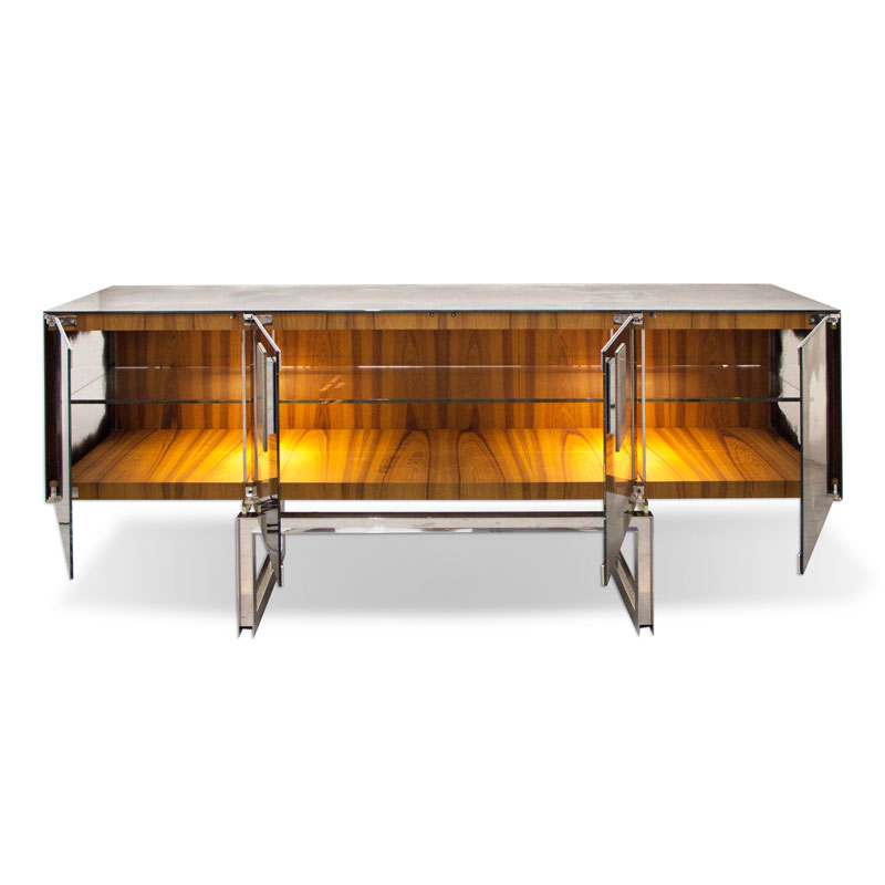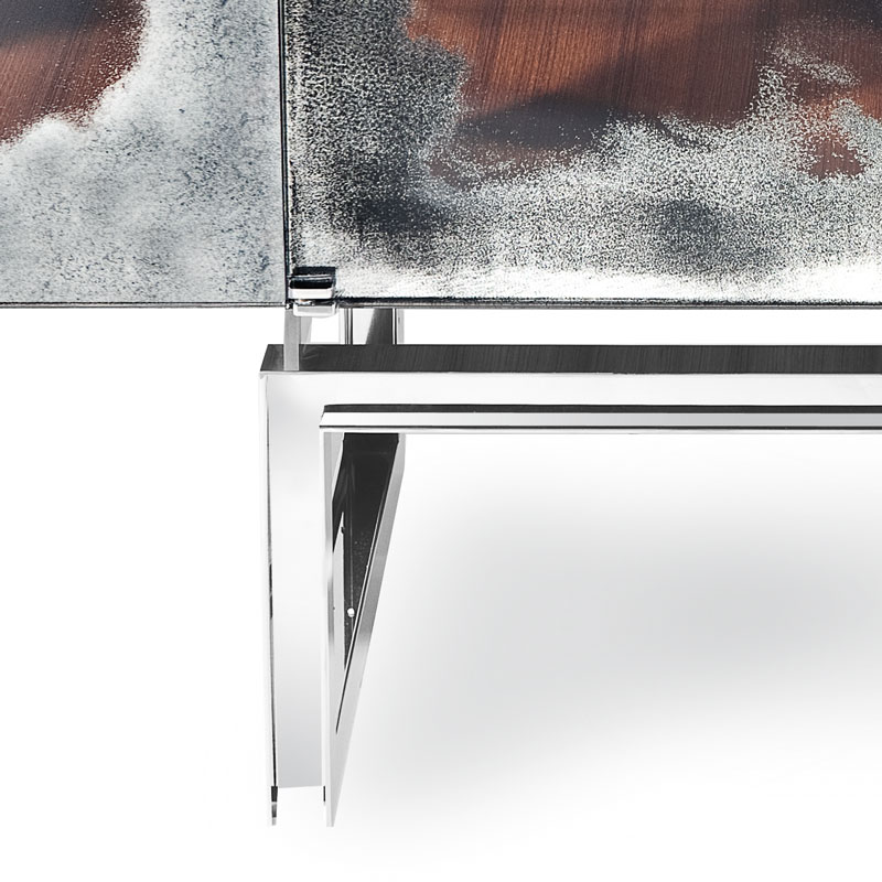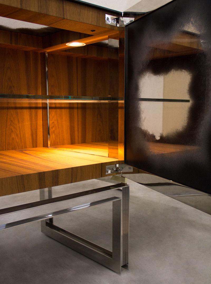 Основание выполнено из массива тика с полуматовым лаковым покрытием. Внутри предусмотрена светодиодная подсветка. Монолитная несущая конструкция изготовлена из полированной нержавеющей стали с элементами из состаренной бронзы. Две боковые распашные двери с механизмом push-pull.
