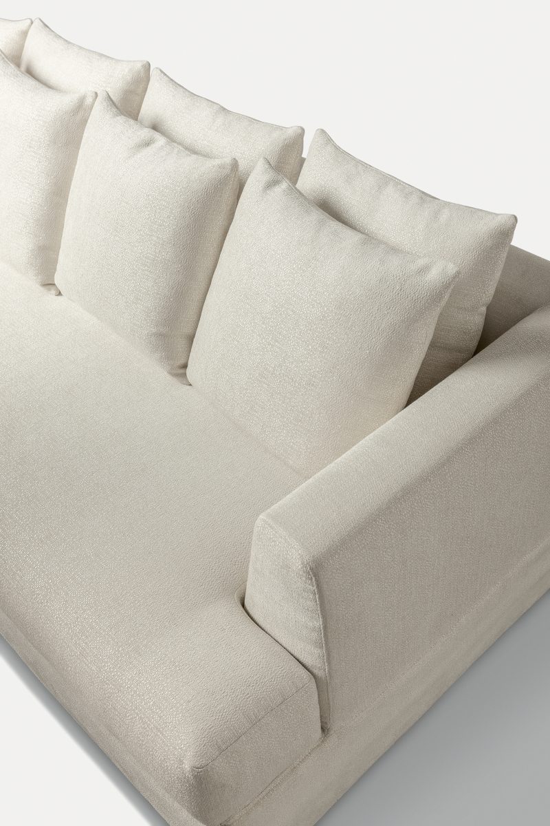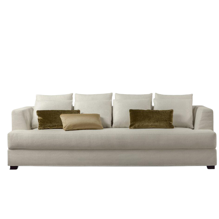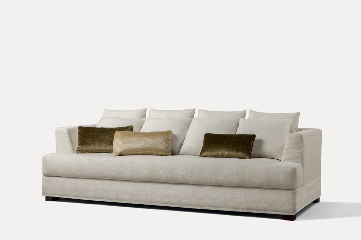 Обивка, доступная в ткани или натуральной коже, несъемная, что придает дивану аккуратный и безупречный вид на долгие годы.