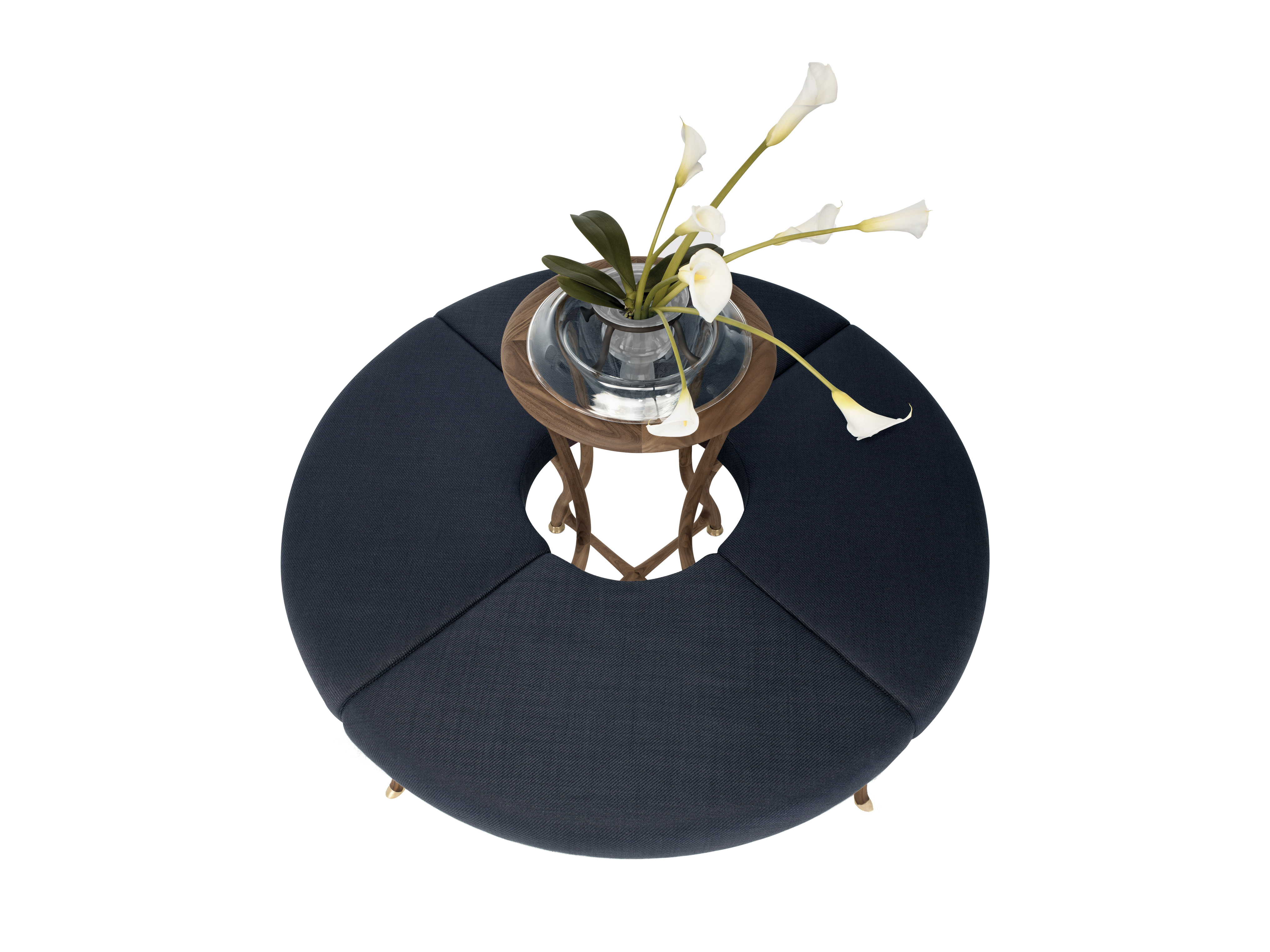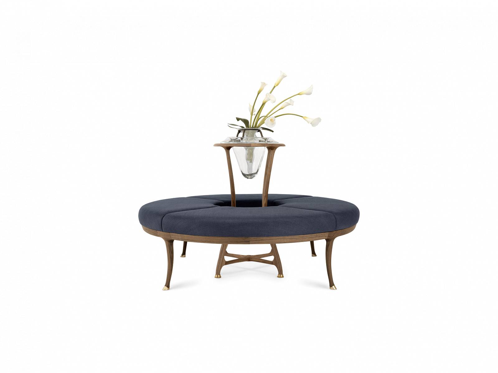 Этот диван был разработан Роберто Лацзерони в 1992 году для сферы гостеприимства, но в равной степени подходит и для просторных домов. Large Flower — круглый диван чрезвычайно изысканного дизайна, который можно разместить в центре комнаты или в холле большого отеля. Отличительной особенностью этой модели является отсутствие мягкой спинки. Фактически, в центре круглого сиденья находится подставка из массива американского ореха, на которой стоит двойная ваза из прозрачного выдувного стекла. Внутреннюю вазу поддерживает конструкция из полированной латуни, которая, в свою очередь, опирается на внешнюю вазу. Дизайн представляет собой возврат к эпохе и стилю 1800-х годов, переосмысленный в современном ключе: образ действий Лацзерони призывает к трансверсальному подходу к дизайну, вдохновленному далеким или близким прошлым и отражающему широкий спектр влияний. Детали переданы с большой точностью: ноги напоминают лапы животного, а кончики ног из полированной латуни намекают на антропоморфные формы. ( Круглый диван из массива американского ореха. Центральный деревянный держатель для вазы с кронштейном из полированной латуни и