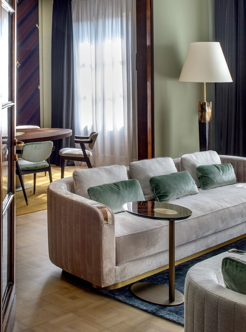 Элегантные изогнутые вставки из рога на подлокотниках подчеркивают утонченное мастерство исполнения. Основание из лакированного дерева с сатинированным латунным эффектом дополняет изысканный дизайн.