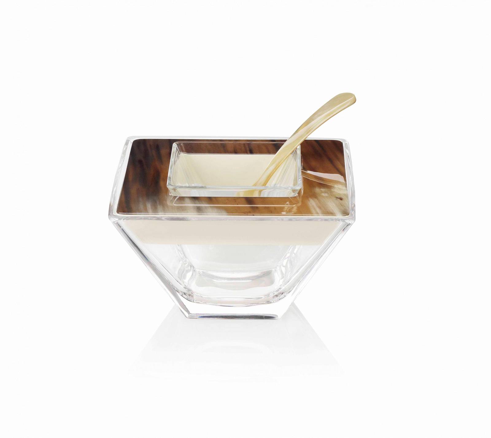 В комплект входит чаша, в которую традиционно кладут лёд и изящная ложка из коровьего рога, инертного материала, который идеально сохраняет чистый вкус драгоценной икры.
