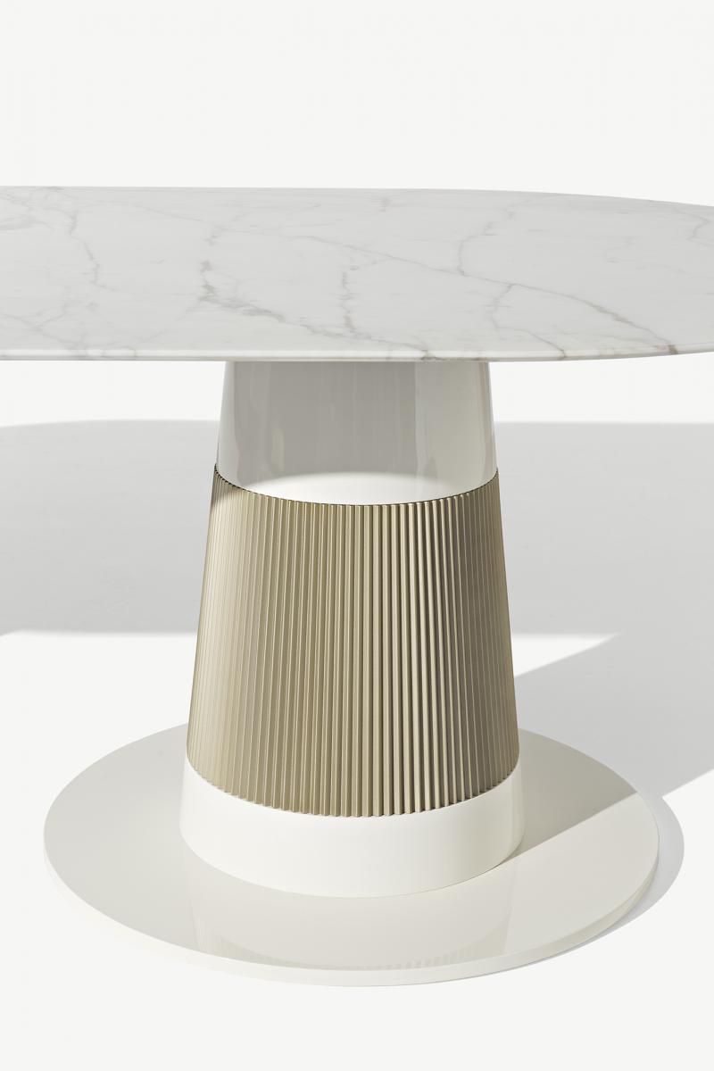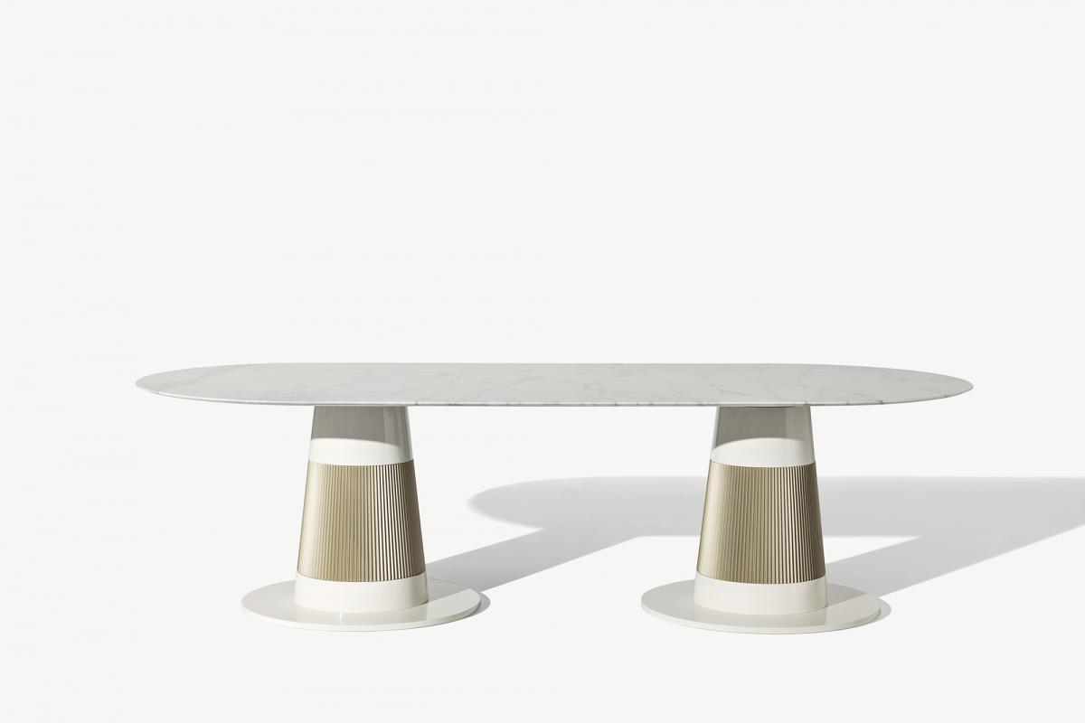 Основание стола состоит из двух рифленых металлических опор в нейтральной цветовой гамме, создающих ощущение устойчивости и визуальной легкости. Благодаря сбалансированному сочетанию материалов и форм, Oasis Turner становится элегантным акцентом в любом пространстве, подчеркивая его стиль и индивидуальность.