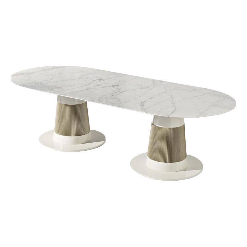 Обеденный стол Oasis Turner привлекает внимание утонченным дизайном, сочетающим современную эстетику и сдержанную роскошь. Его прямоугольная столешница с плавно закругленными углами выполнена из благородного белого мрамора, что придает модели изысканность и делает ее идеальным выбором для интерьеров в стиле модерн и минимализм.