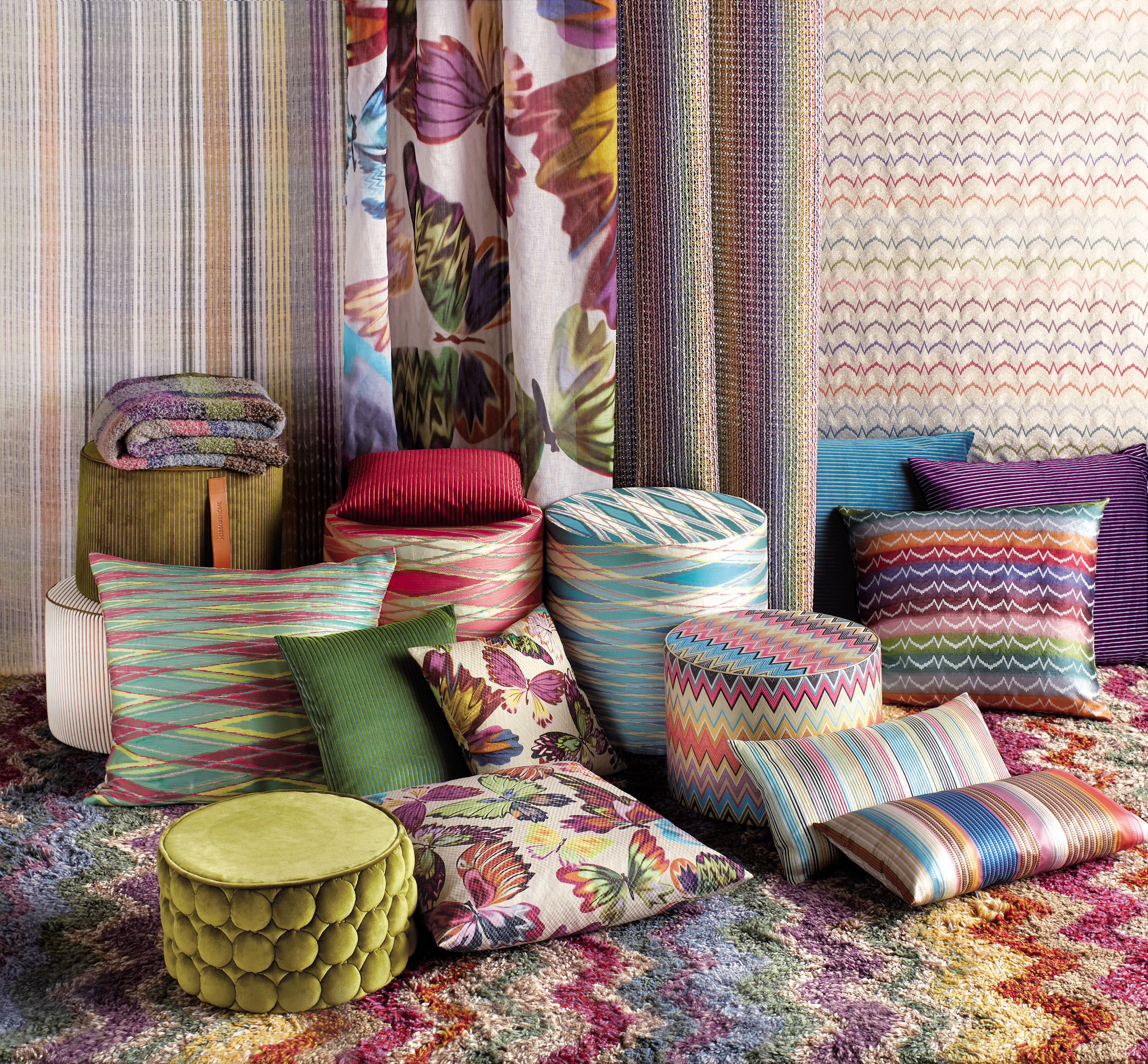 Коллекция бренда Missoni home, запущенного в 1983 году как линия домашнего текстиля модного дома Missoni, завоевавшая мировое признание своими узнаваемыми орнаментами и мастерством в работе с цветом, с каждым годом пополняется новыми предметами интерьера и декора, становясь богаче и разнообразнее. Сегодня Вы можете выполнить весь интерьер своего дома в продукции Missonihome, ведь на данный момент бренд предлагает широкий и многообразный ассортимент на любой вкус: мебель для интерьеров и экстерьеров, освещение и ковры, декоративные пуфы и подушки, ткани и тюль, халаты и полотенца, постельное бельё и пледы, аксессуары и посуда.