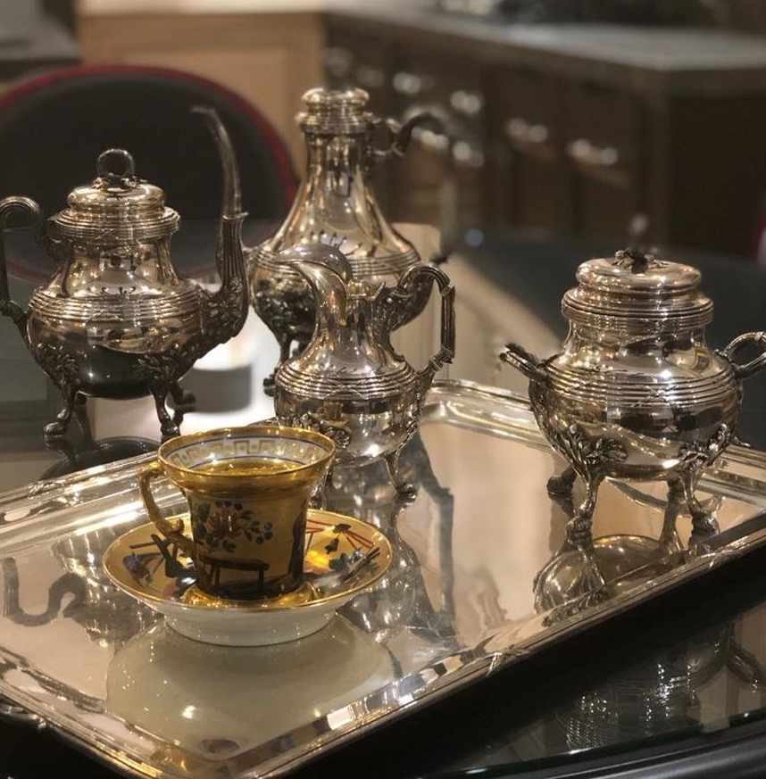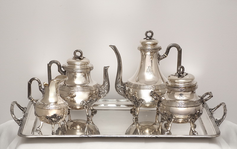 Состоит из: поднос, чайник, кофейник, сахарница, молочник