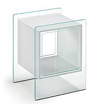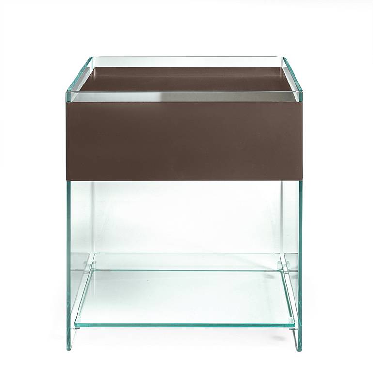 За монолитным стеклянным фасадом, олицетворяющим безупречную чистоту линий, скрывается вместительный ящик, который может быть покрашен в белый, черный и коричнево-серый цвет. Столешница с «открытым» прозрачным сегментом — фирменный приём, который обнажает суть материала, превращая обычную поверхность в изысканный постамент для ваших вещей.