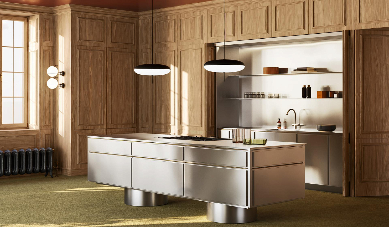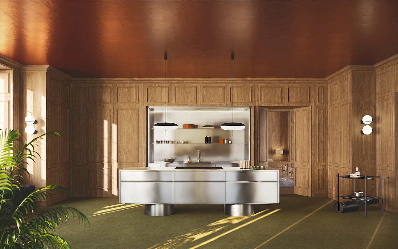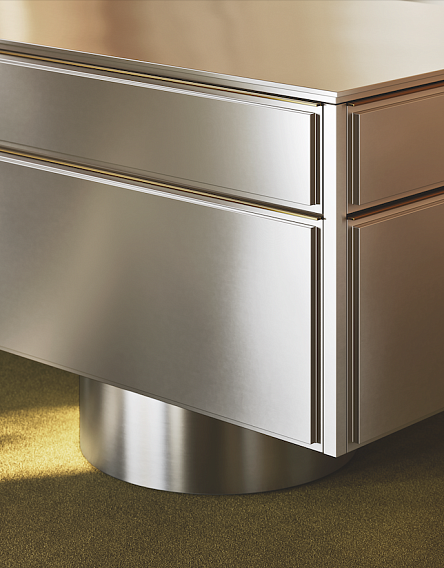 Центральный элемент дизайна — винтажная матовая сталь, придающая интерьеру строгость и уникальность. Фасады с оригинальным трёхмерным эффектом дополнены латунным профилем, который служит одновременно и ручкой, и декоративным элементом, смягчая брутальный облик.