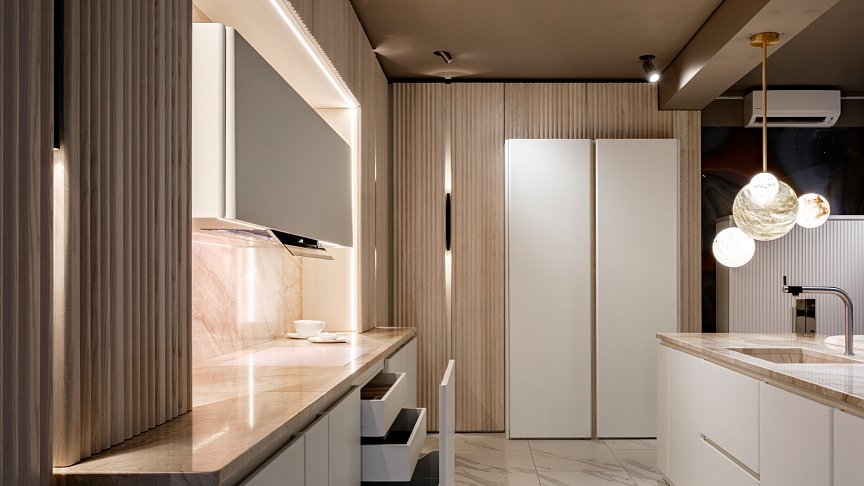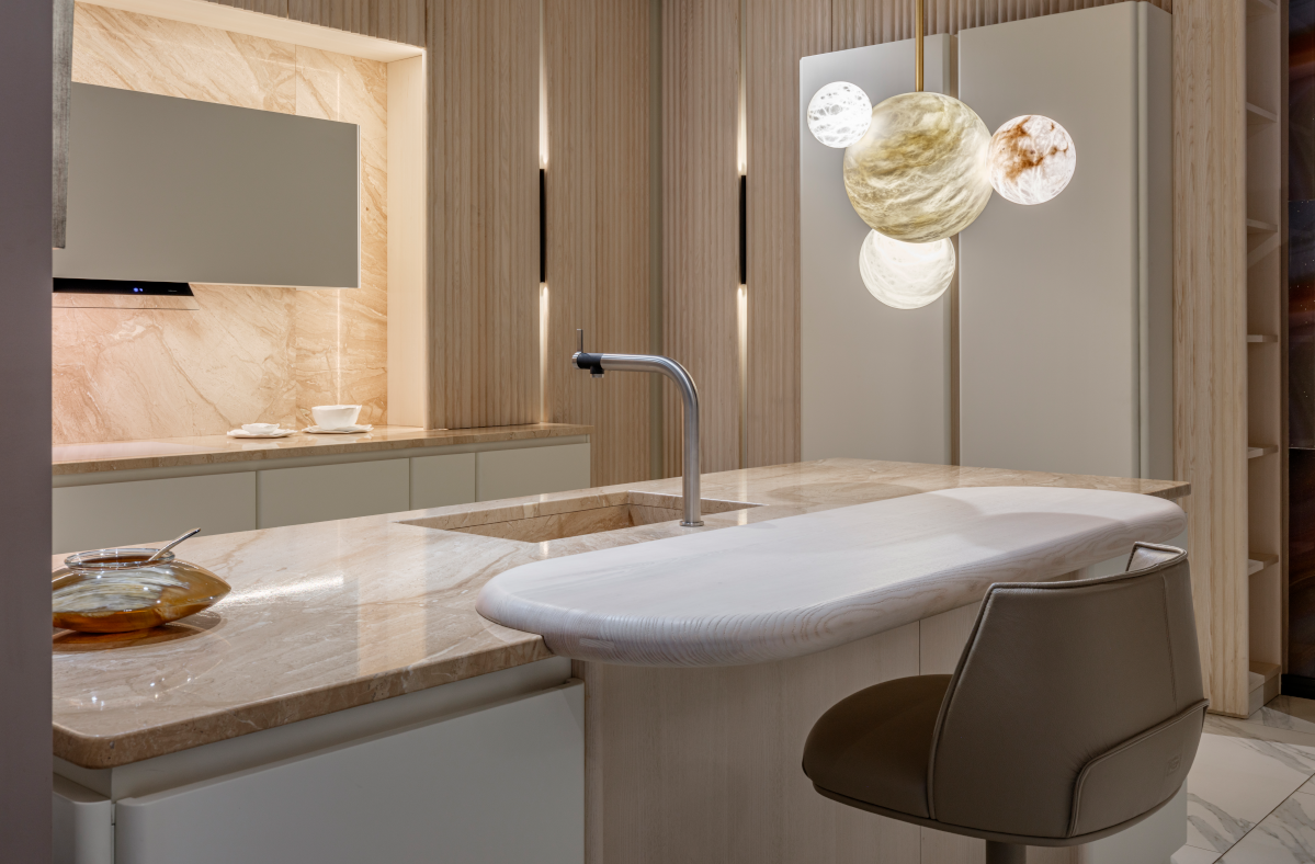 Проект сочетает изысканность с практичностью: просторные шкафы и функциональный остров со столешницей для закусок создают идеальное пространство для готовки и общения.