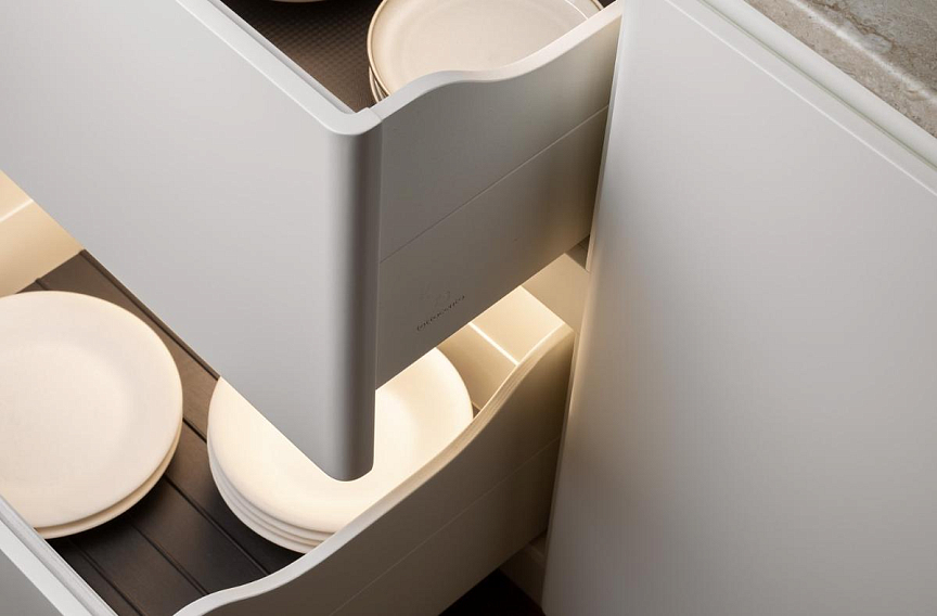 Чтобы придать интерьеру воздушность и изысканность, дополните кухню лакированными модулями модели Etesia с фасадами, выделяющимися фирменными скругленными кромками.
