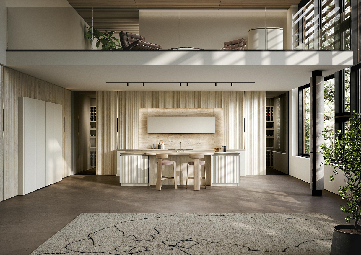 Кухня Levante, созданная Микеле Марконом, искусно сочетает современные тренды и филигранное мастерство итальянского производства. Модель из светлого ясеня с мягкими линиями буазери и центральным островом волнообразной формы отсылает к эстетике XIX века.