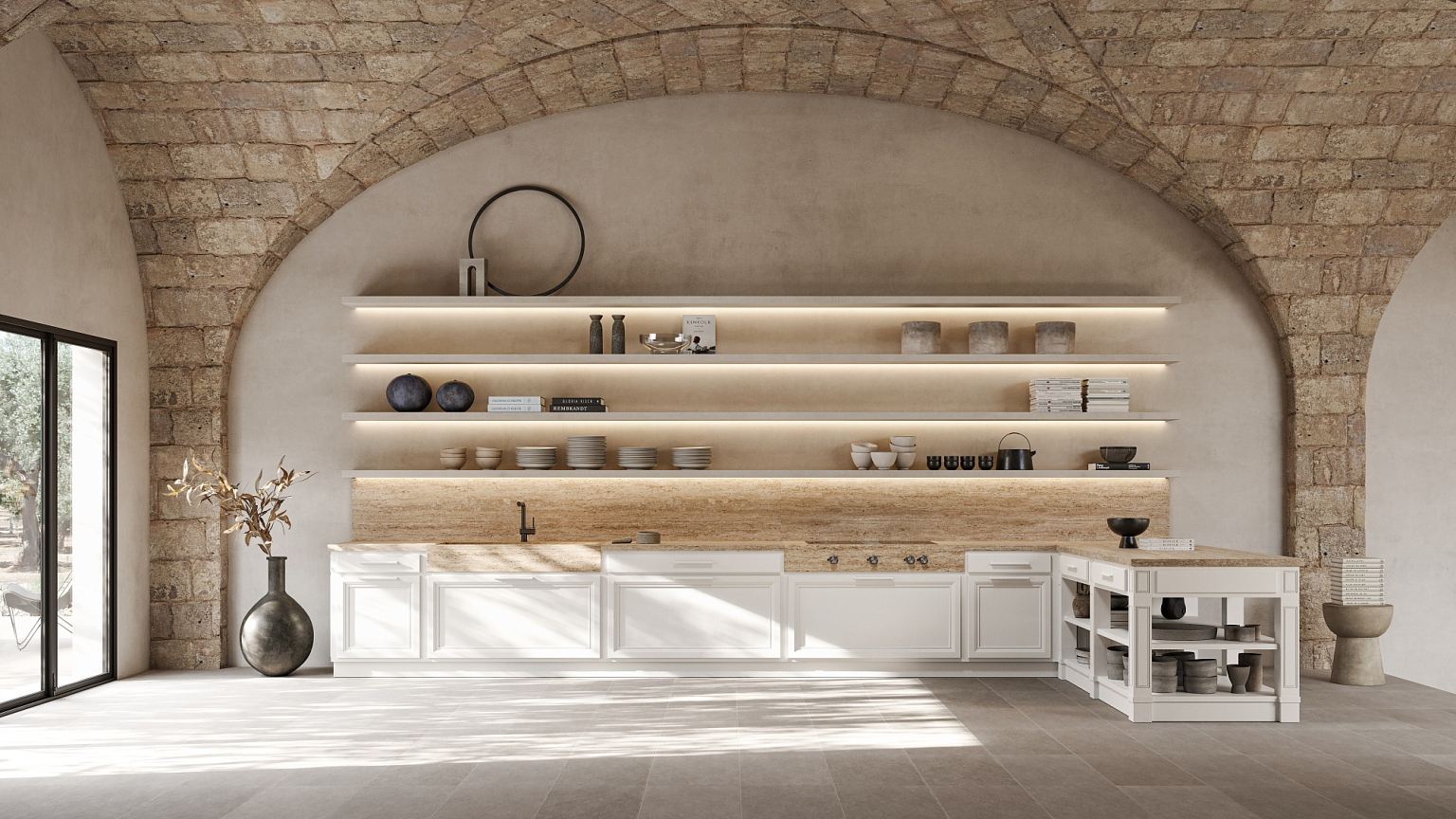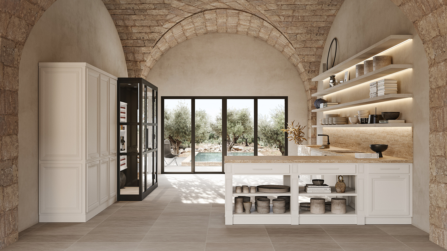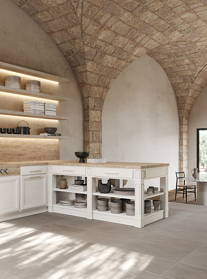 Лакированный дуб с открытыми порами, нежные оттенки и драгоценные материалы, смешанные с современным дизайном, придают этой новой кухне классический колорит. Цвет лакированного дерева Talco прекрасно сочетается с травертином в новой кухне L'Ottocento.