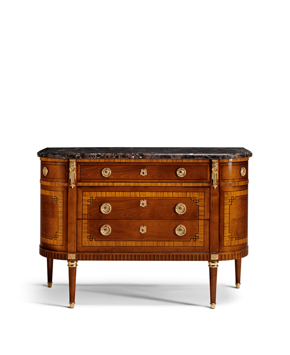 Комод Людовика XVI, 3 центральных ящика, 2 изогнутые боковые дверцы, мраморная столешница см. 3. Доступен также с деревянной столешницей. ОТДЕЛКА вишня с инкрустацией цитронье, мрамор Emperador dark , латунь golden brass