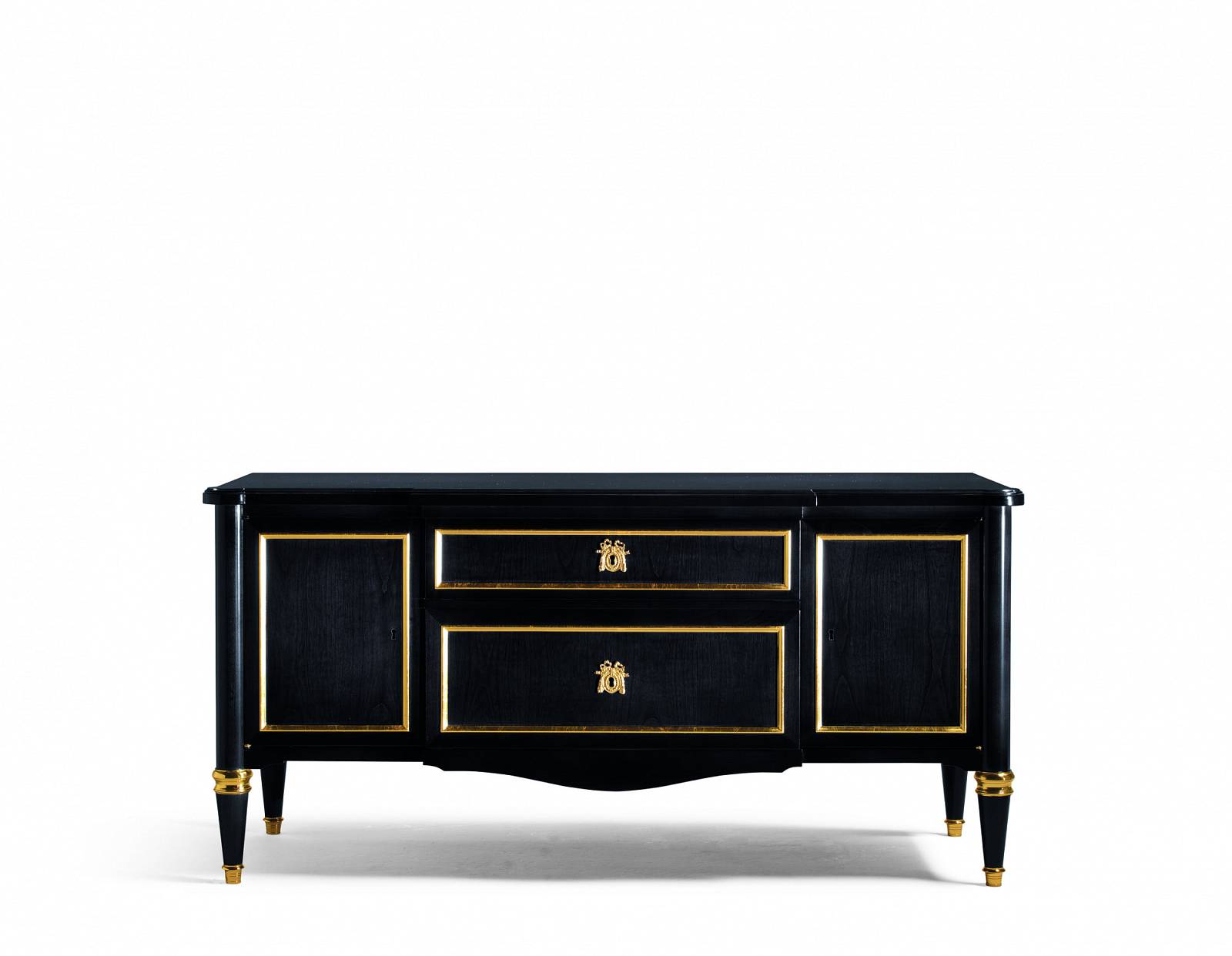 Тумба под телевизор Людовик XVI, 2 центральных ящика с замком, 2 боковые двери с замком, столешница деревянная.ОТДЕЛКА T/NERO with golden profiles, golden brass