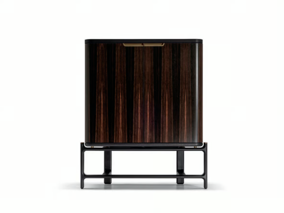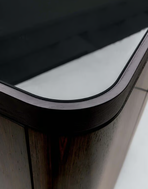 Каркас из массива ясеня, шпон или инкрустация American walnut, шпон эбенового дерева. Столешница в шпоне ясеня, из тонированного стекла или мрамора. Дополнительно выдвижные ящики в коже, подсветка.