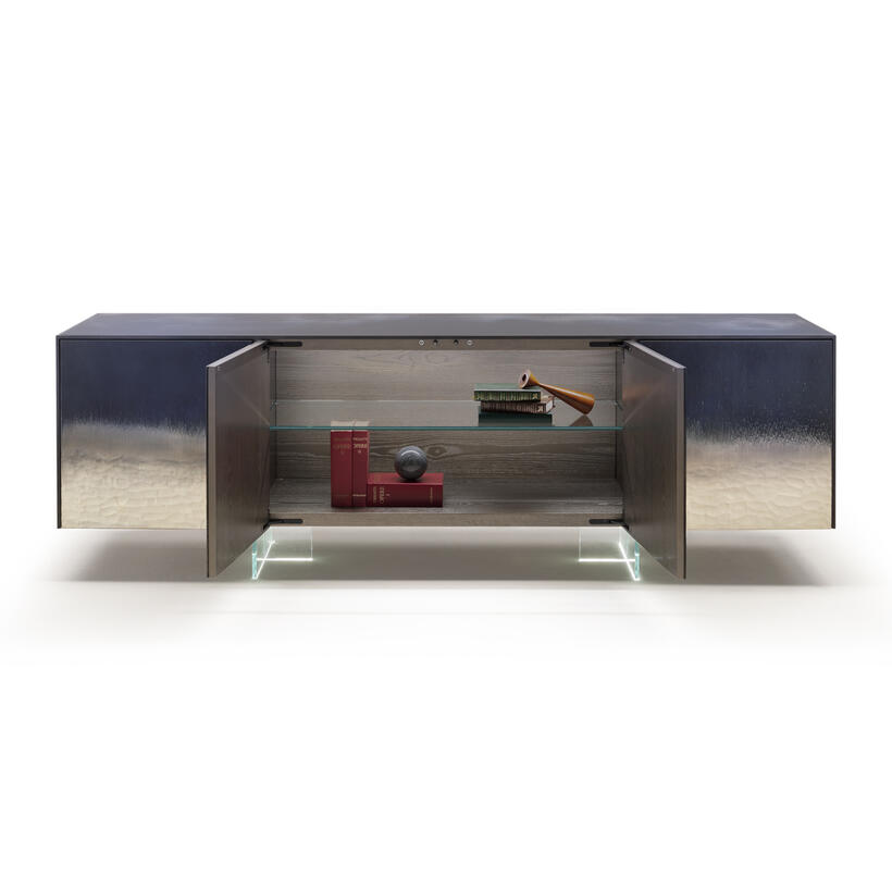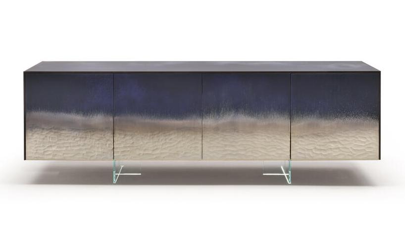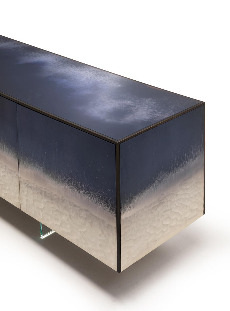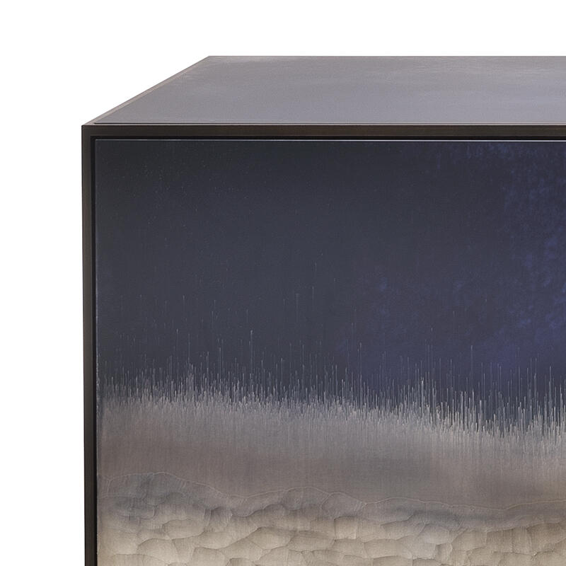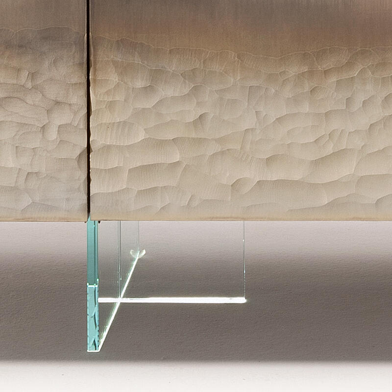 Эксклюзивный декор Stromboli на прозрачном стекле — визитная карточка этого комода. Дизайнер Giovanni Luca Ferreri вдохновился видами вулкана Stromboli, который находится на острове чуть выше Сицилии. Мастера вручную создают на стекле настоящую абстрактную картину, где изображен вулкан после извержения. Мир только что обрел покой, все силы природы сошлись воедино, порождая взрыв цвета и света, неподвластный ни живописи, ни фотографии. Эти цветовые и текстурные нюансы можно запечатлеть и сохранить лишь на поверхности стекла.