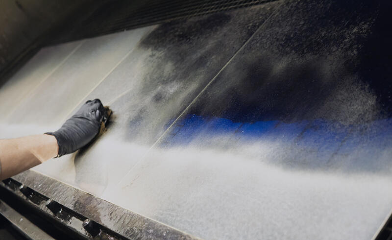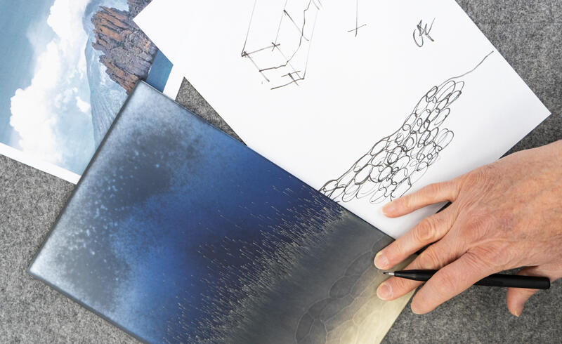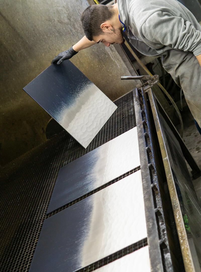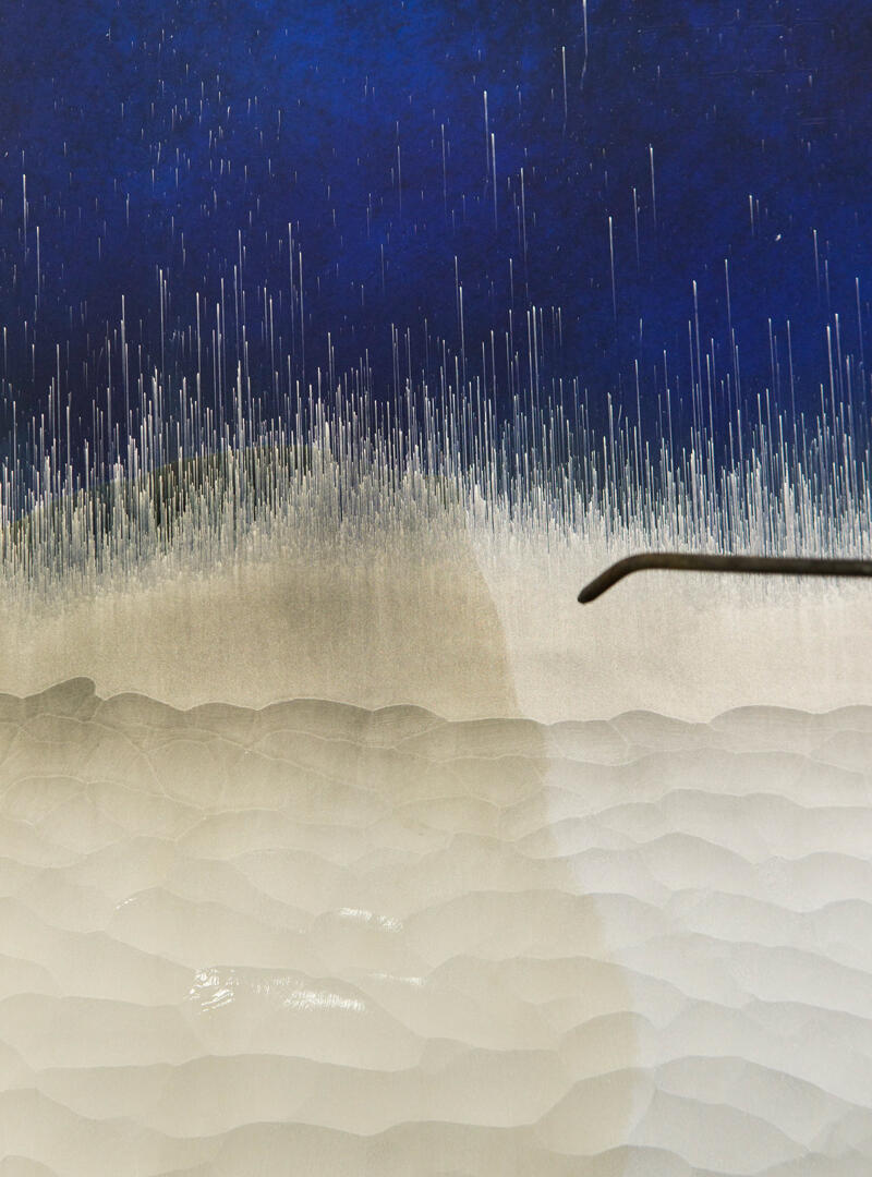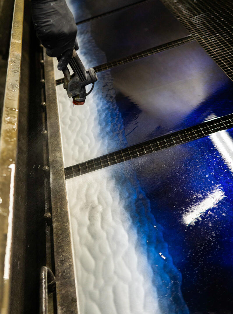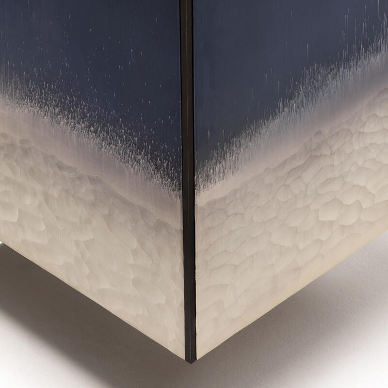 Декор Stromboli: лицевая поверхность матирована кислотой и украшена ручной гравировкой и серебрением, а тыльная сторона обработана в синей гамме с напылением серебра и эффектом «антик» (искусственное состаривание).