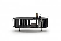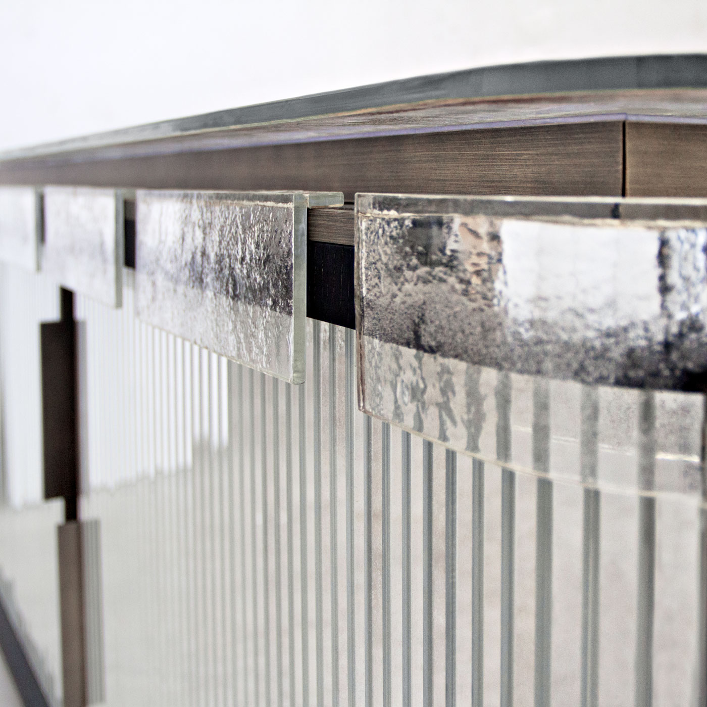 Фигурная столешница из стекла с частично зеркальной поверхностью.