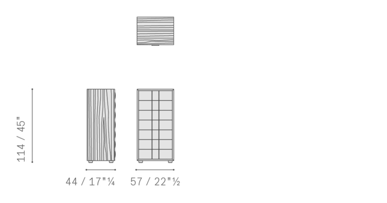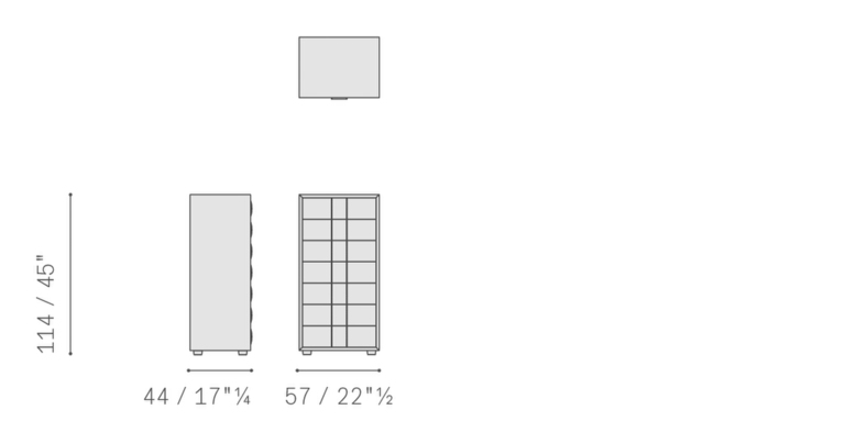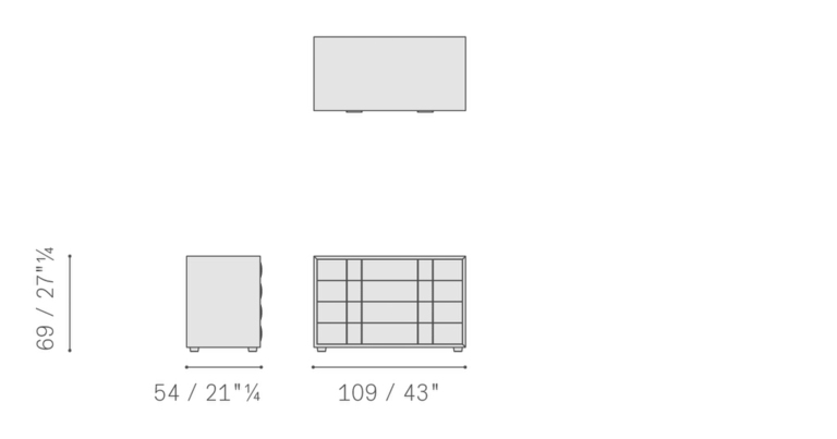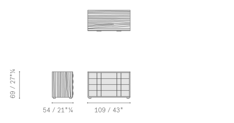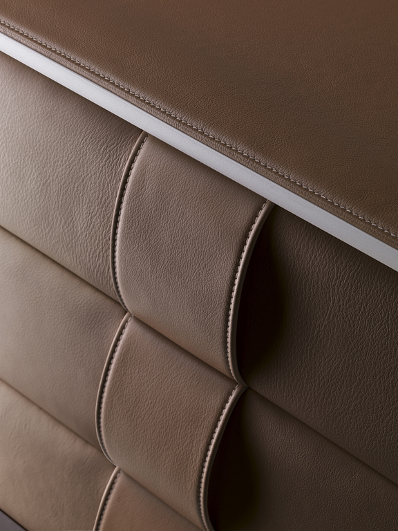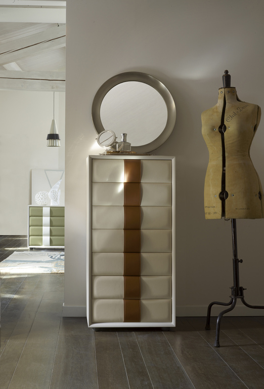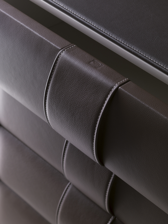 Комоды, прикроватные тумбы и высокие шкафы Obi оснащены ящиками на металлических направляющих с механизмом мягкого закрытия. Фасады ящиков и ручки полностью обтянуты кожей Pelle Frau®, которая может быть выполнена в тон основной обивки или в контрастном цвете. Элегантная вертикальная строчка, однотонная или контрастная, добавляет изысканности и декоративности.