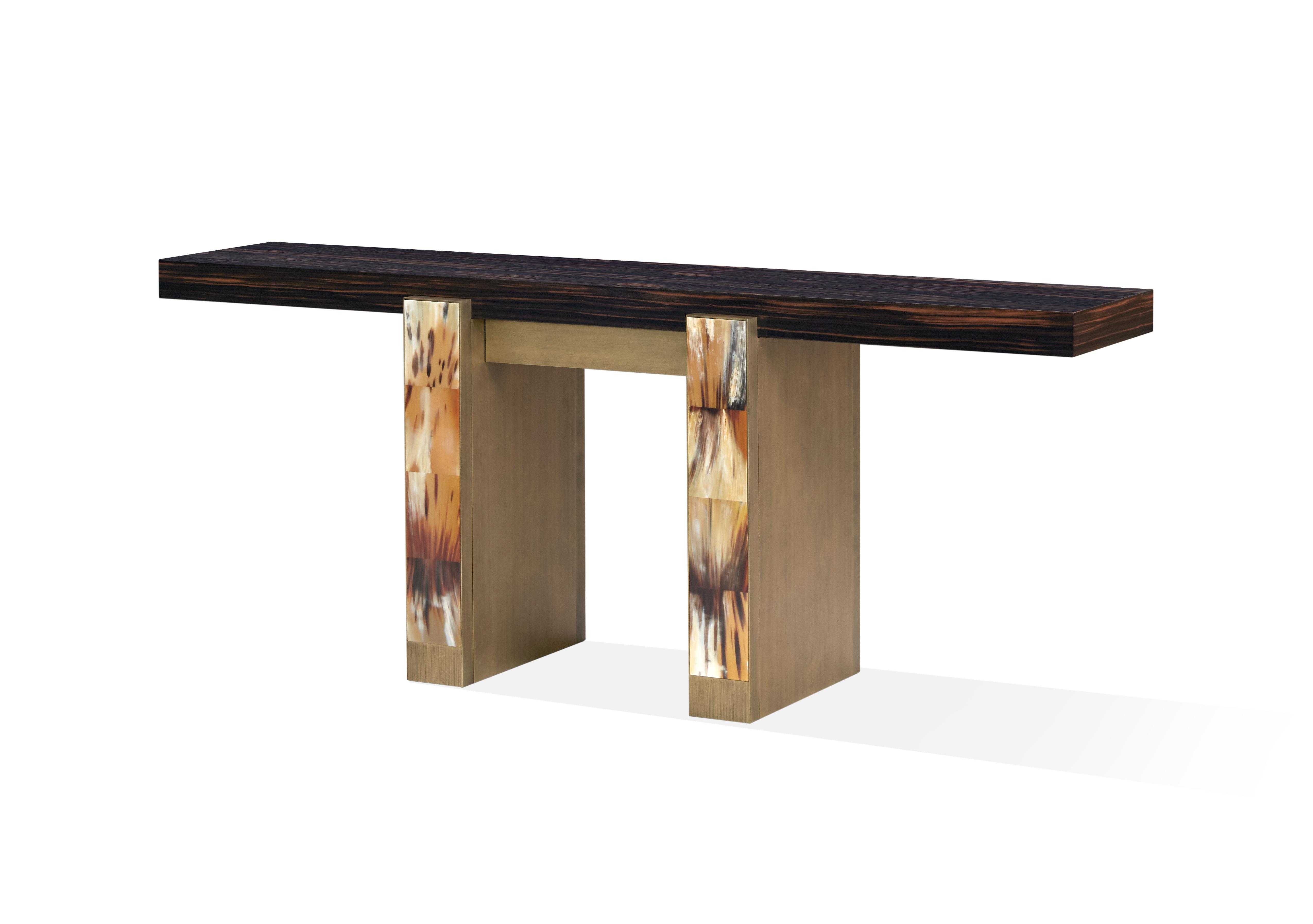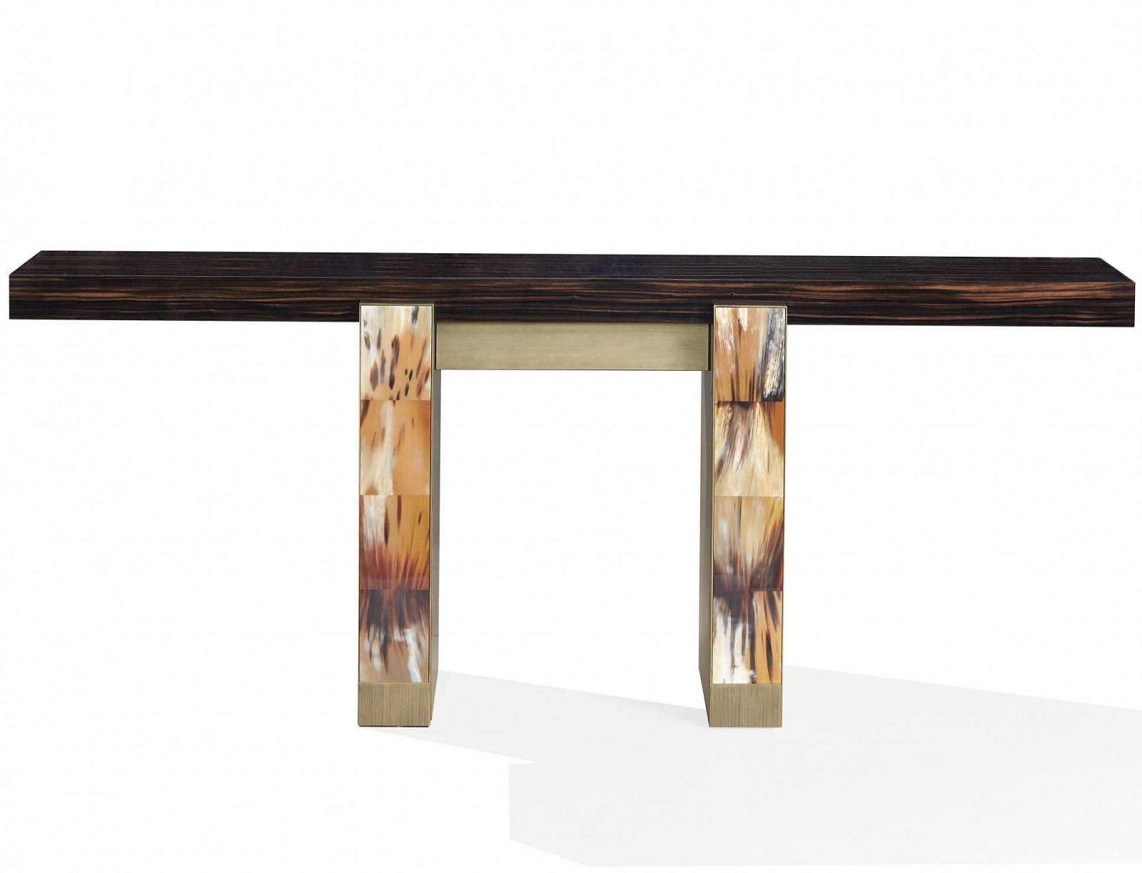 Консоль из макассарского черного дерева с глянцевой отделкой, ножки из обработанного рога и полированной латуни.
