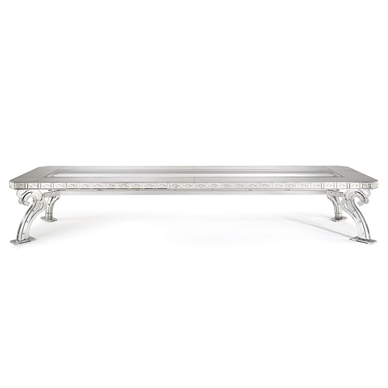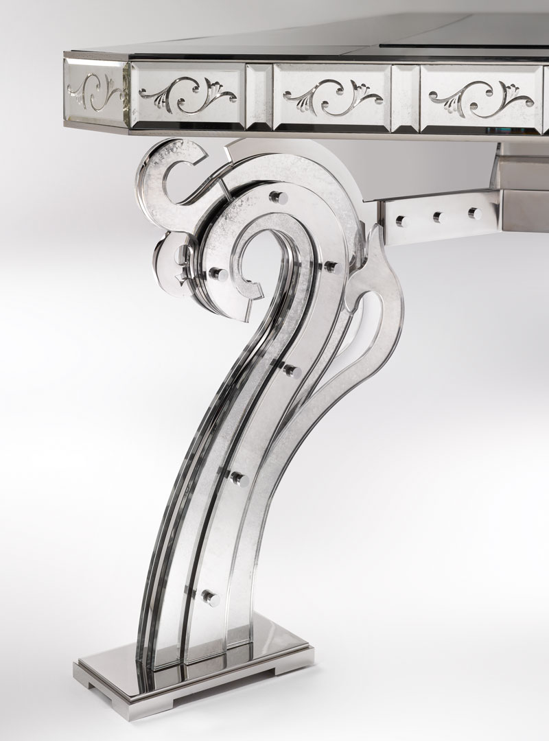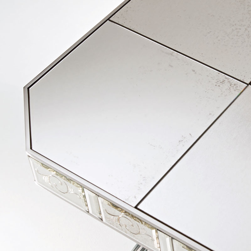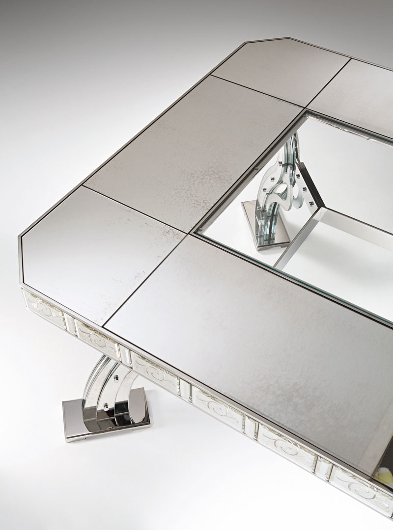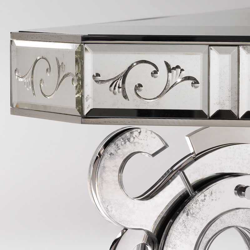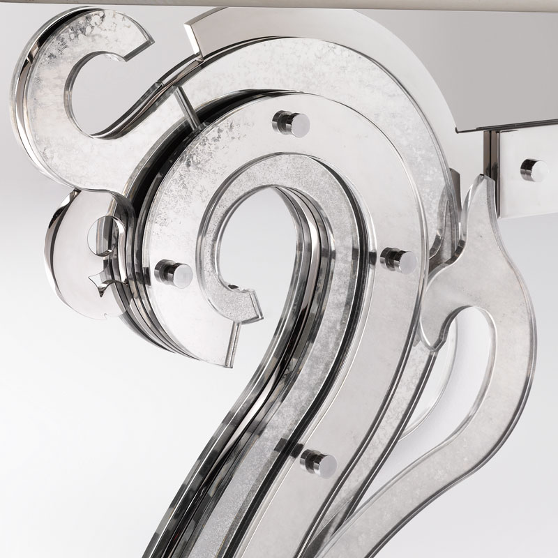 Четыре ножки из нержавеющей стали спиральной формы.Центральная часть столешницы выполнена из прозрачного закаленного стекла.Верхняя рамка из посеребренного стекла с легкой античной отделкой.Рамы из скошенного стекла, гравированного и посеребренного, с легкой античной отделкой.