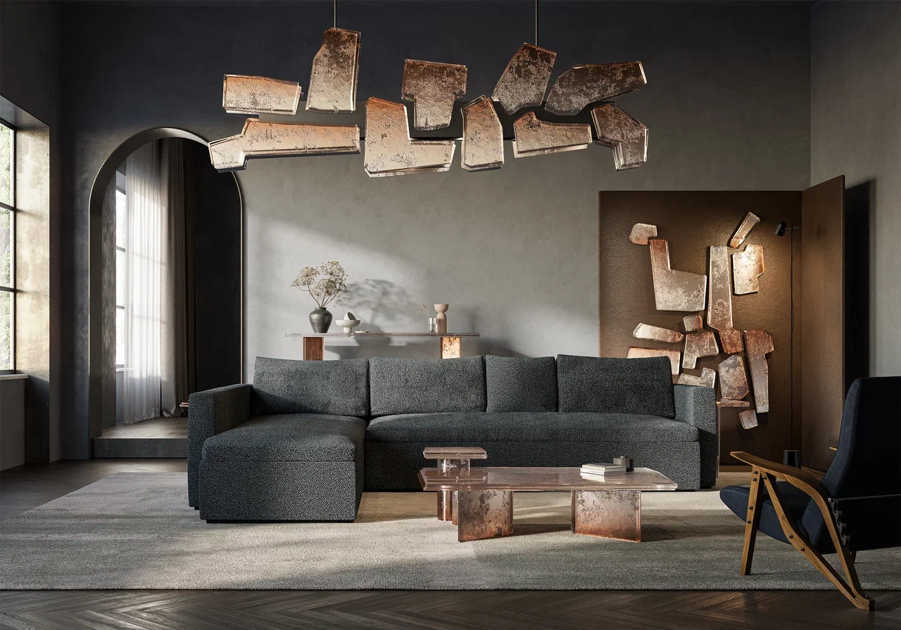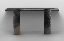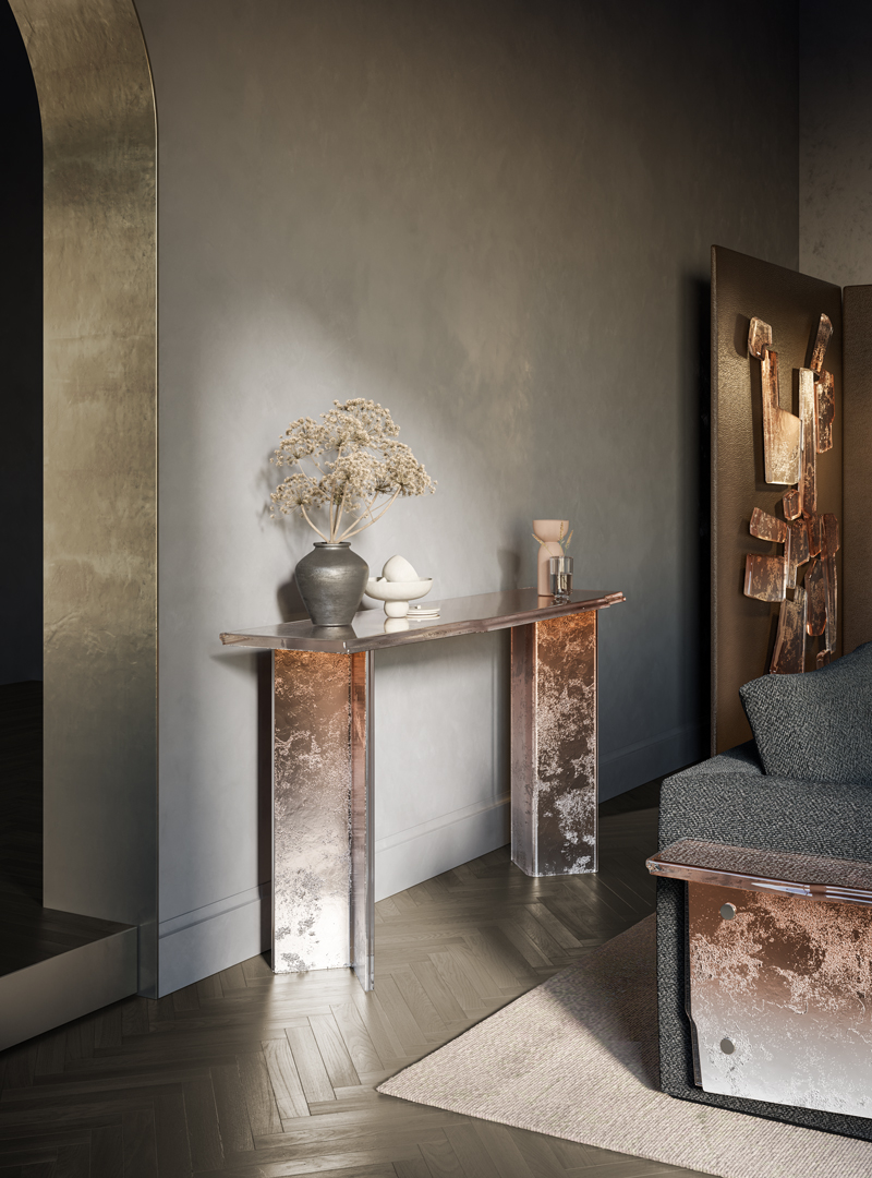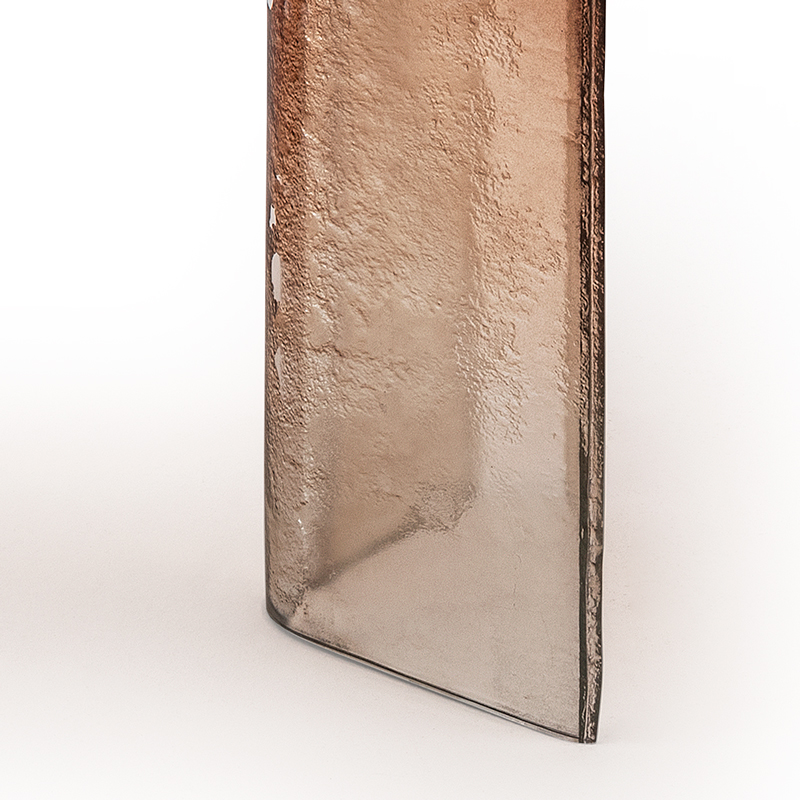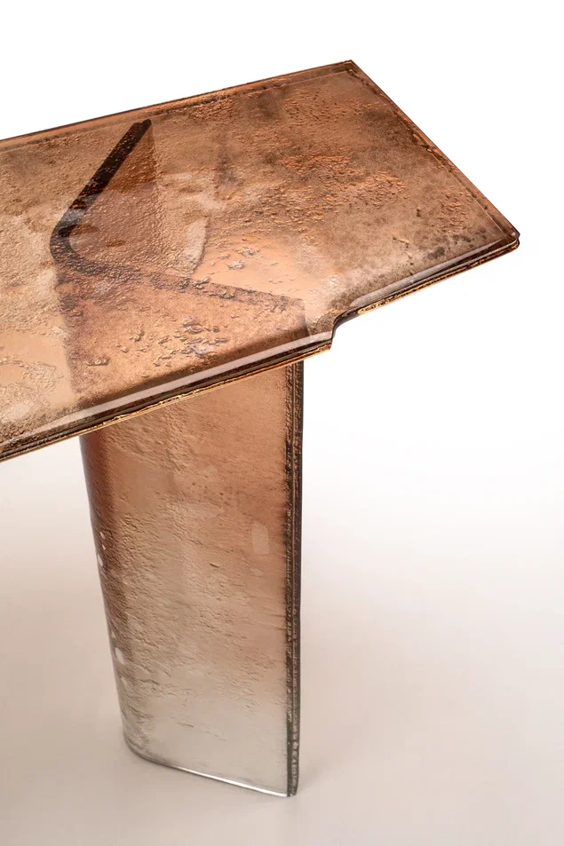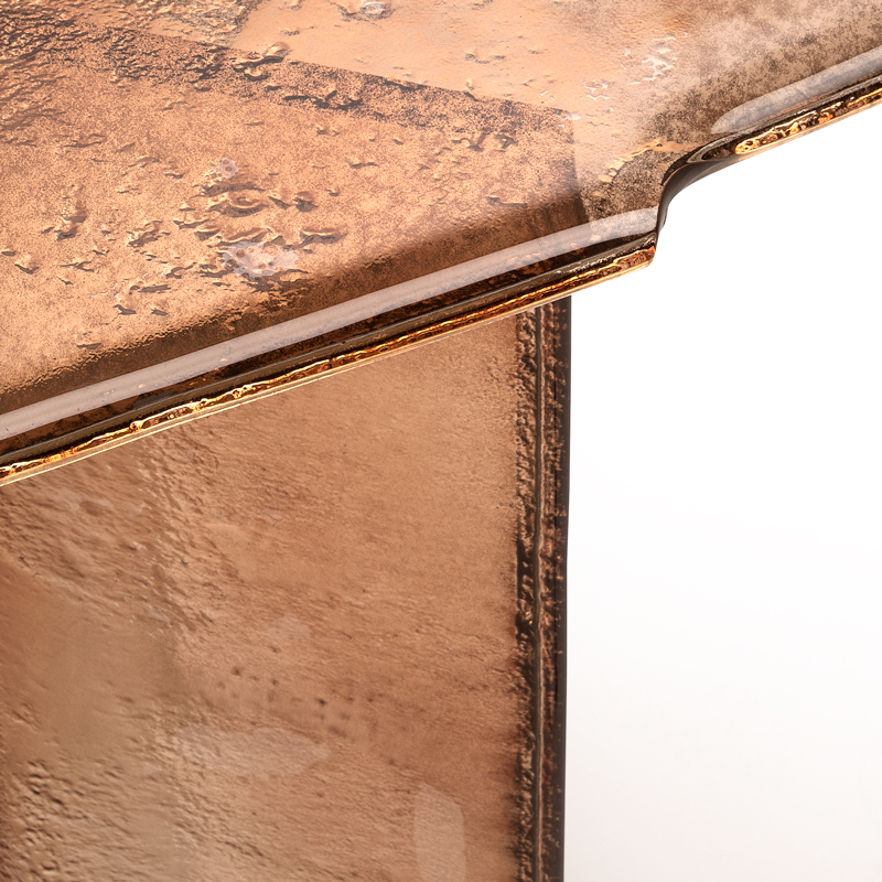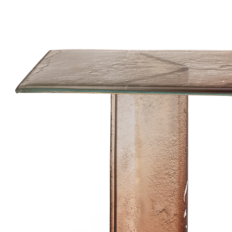 Столешница и ножки выполнены по уникальной технологии из двух слоев стекла, запеченных вместе, что создаёт выразительную фактуру. Все поверхности декорированы лаком, переходящим от насыщенного бронзового тона в прозрачный, с частичным серебрением сзади.