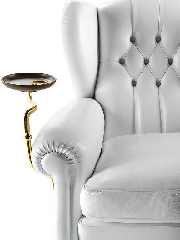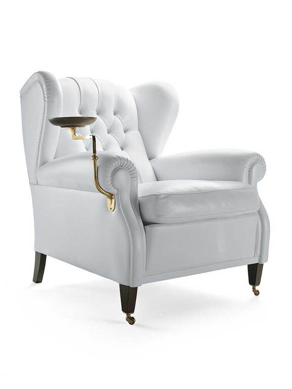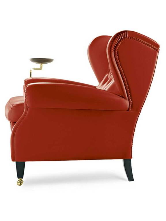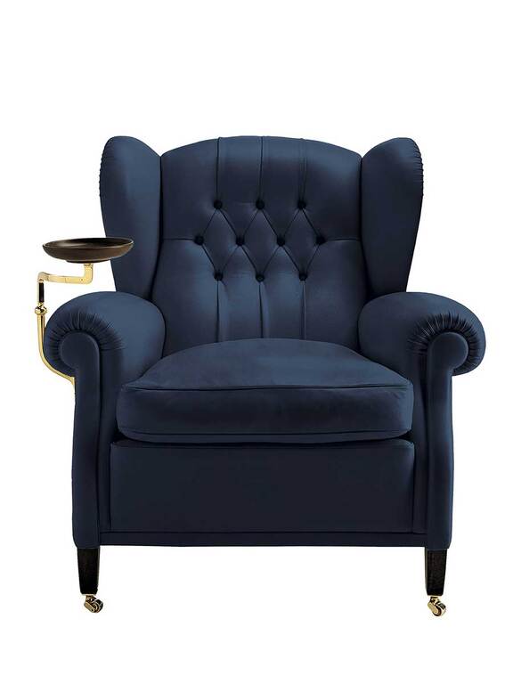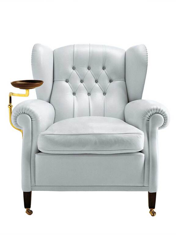 Колесики и металлические элементы (держатель для тарелки, пепельница и номерная табличка) могут быть выполнены с отделкой «золото» или «серый металлик». Кресло «1919» доступно в двух версиях: без держателя или с держателем для пепельницы либо подстаканника (оба варианта можно установить слева или справа).