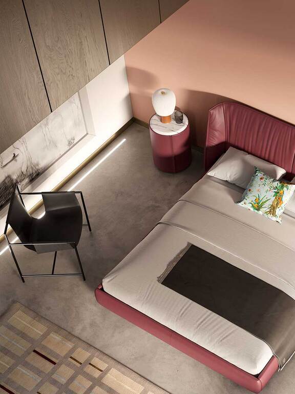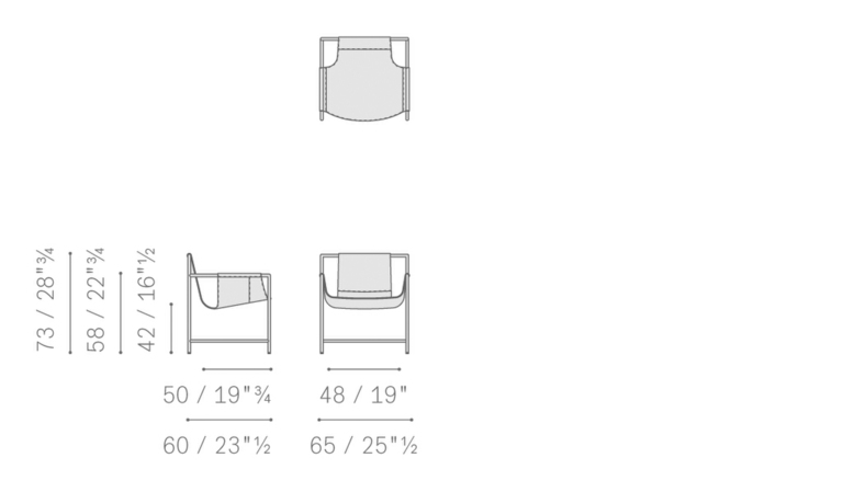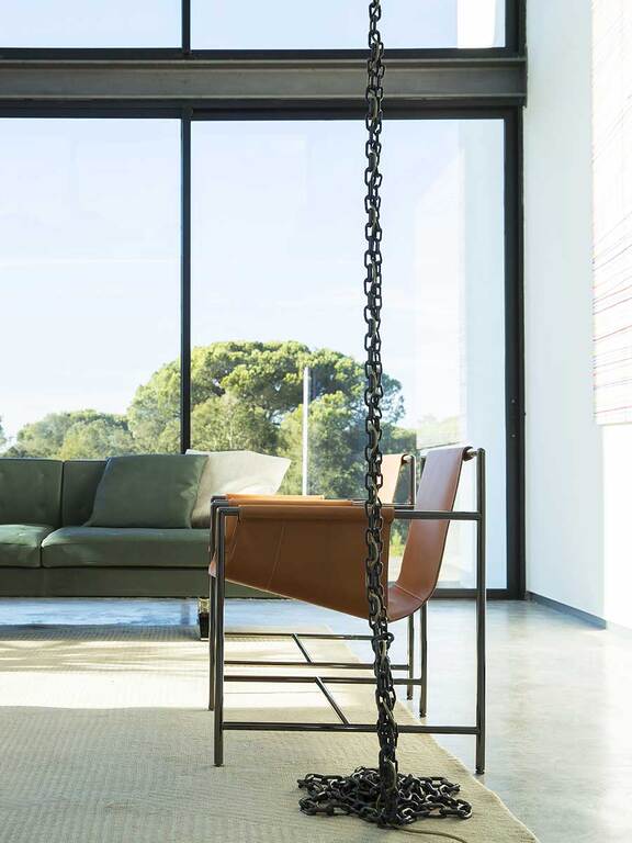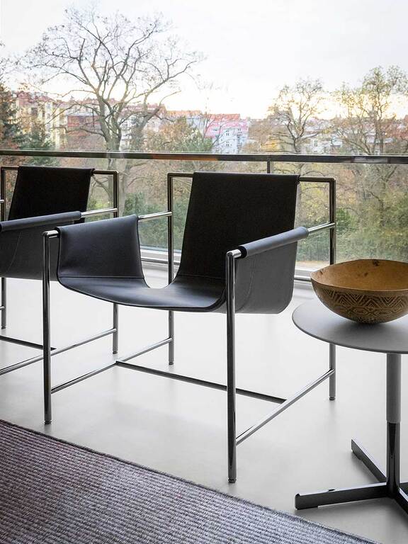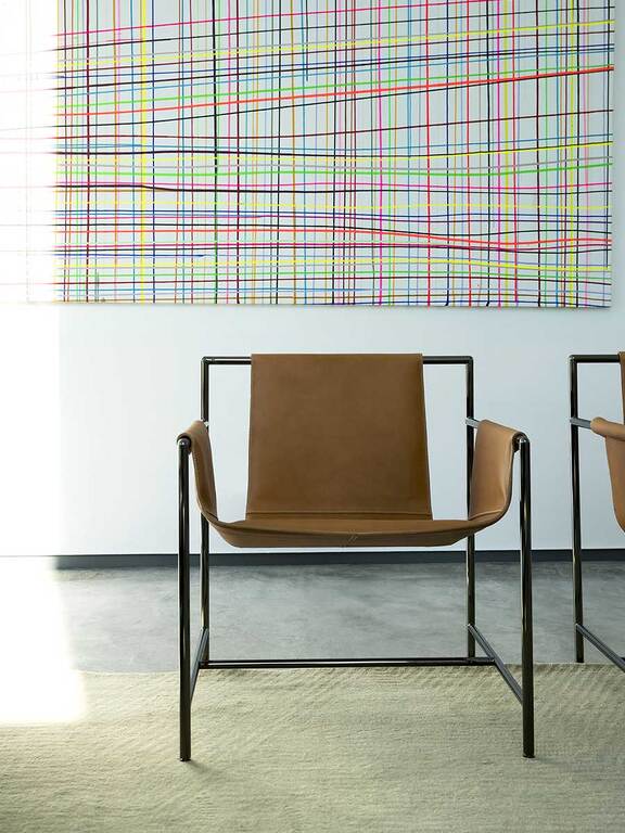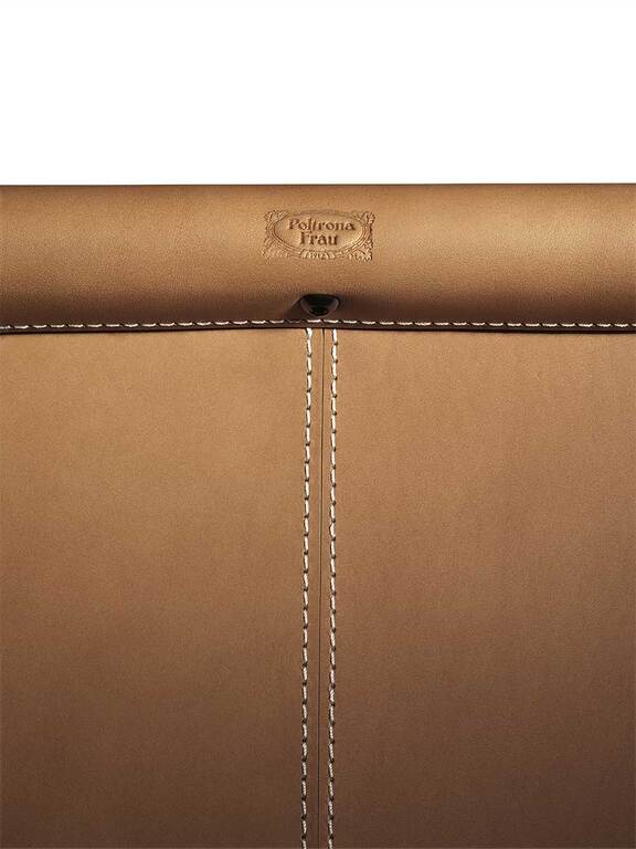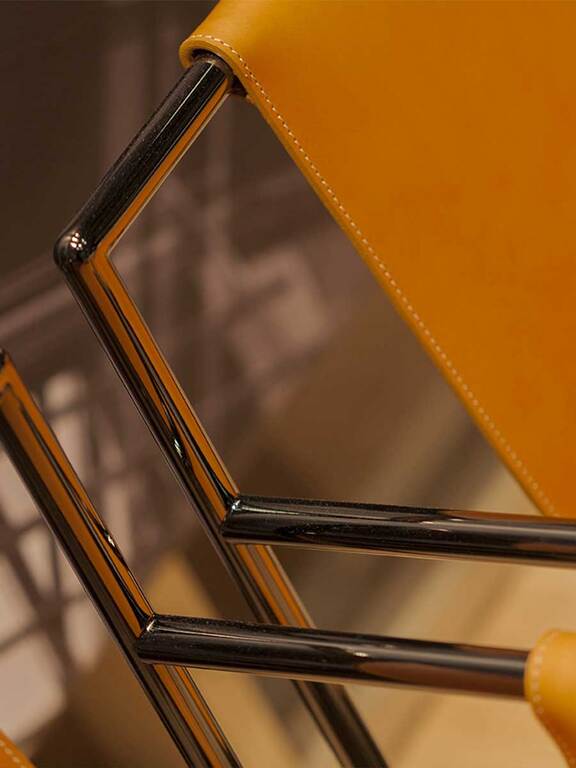 Цельная оболочка из тонкого стального листа полностью обтянута кожей Saddle Extra с контрастной строчкой, а крепления с открытыми винтами придают конструкции выразительный характер.