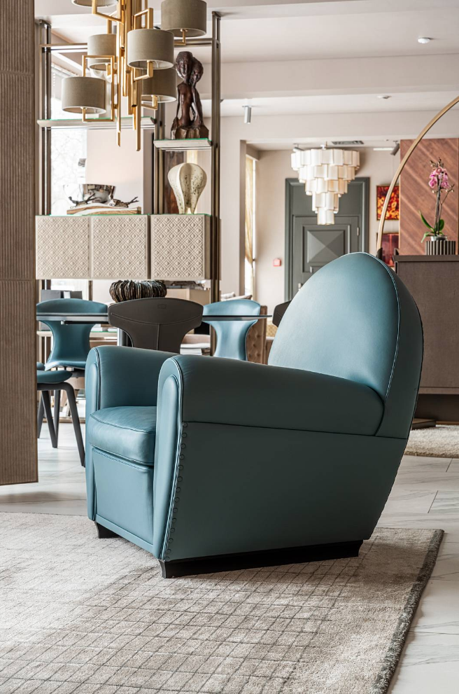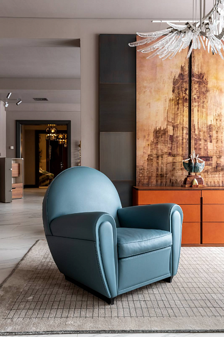 Массив выдержанного бука. Набивка из растительного конского волоса ручной работы и прорезиненного конского волоса, подушка сиденья из гусиного пуха со вставкой из пенополиуретана, которая сохраняет форму. Сиденье, спинка и подлокотники имеют стальные биконические пружины, завязанные вручную и прикрепленные к джутовым ремням. Ряд гвоздей, обтянутых кожей, придает изысканности спинке и бокам кресла. Обивка кожей Pelle Frau® Кожа SC 274 Fresco Blue Wenge.