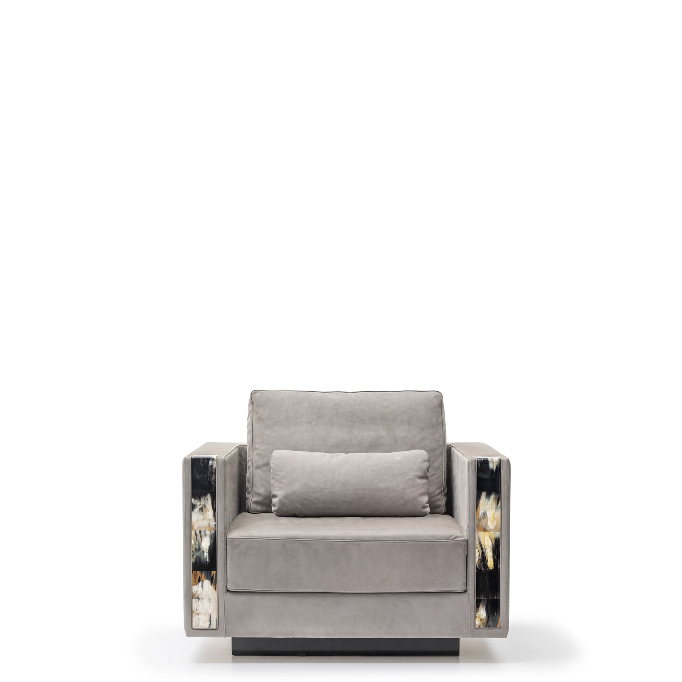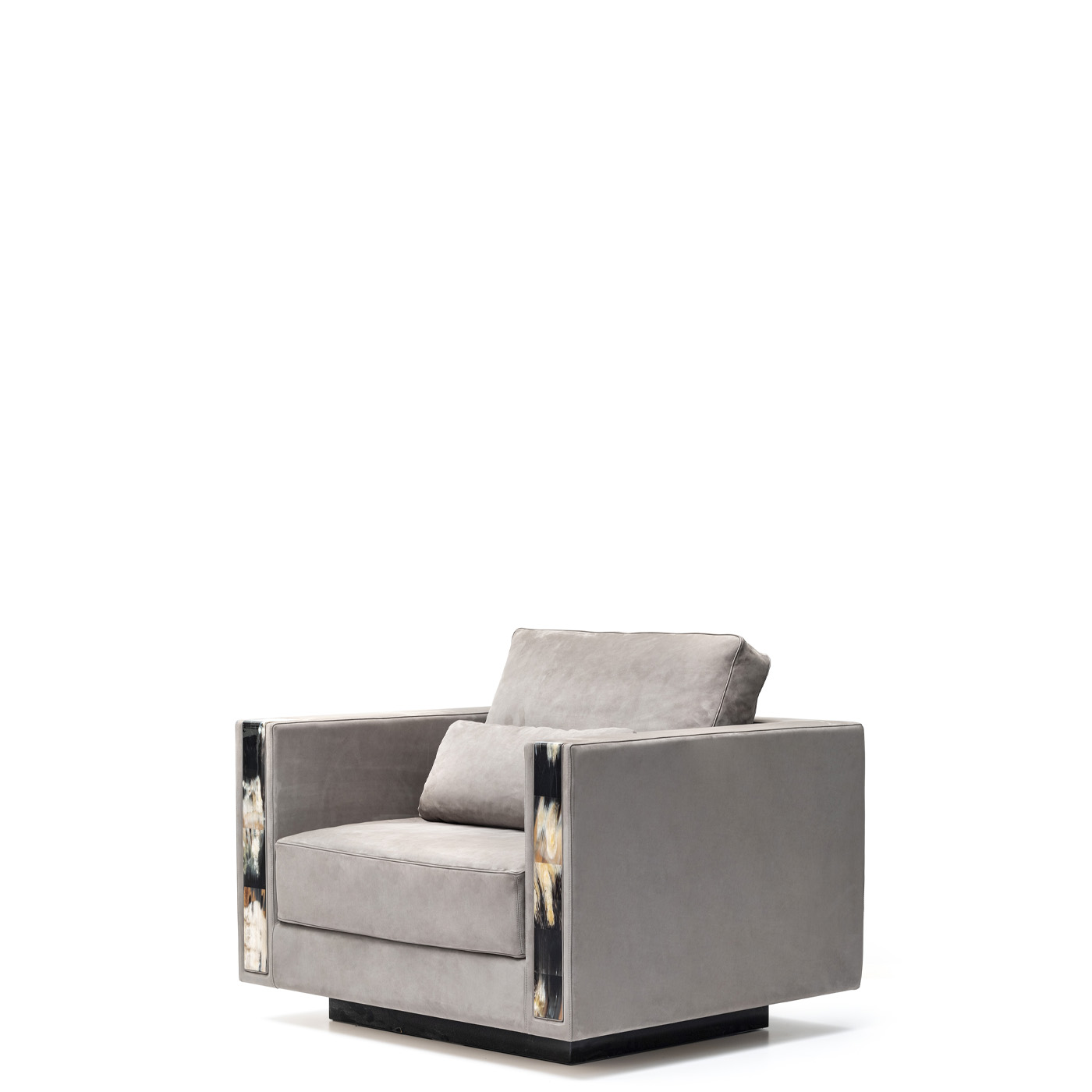 Наполнитель из многослойного пенополиуретана разной плотности, гусиного пуха и мемори-пены обеспечивает безупречное удобство. Уникальные темные роговые инкрустации на подлокотниках придают креслу выразительный характер, делая его нестандартным дизайнерским решением, способным подчеркнуть индивидуальность любого интерьера.