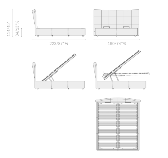 190 х 223 х h 114/34 см. Спальное место 170 х 200 см.