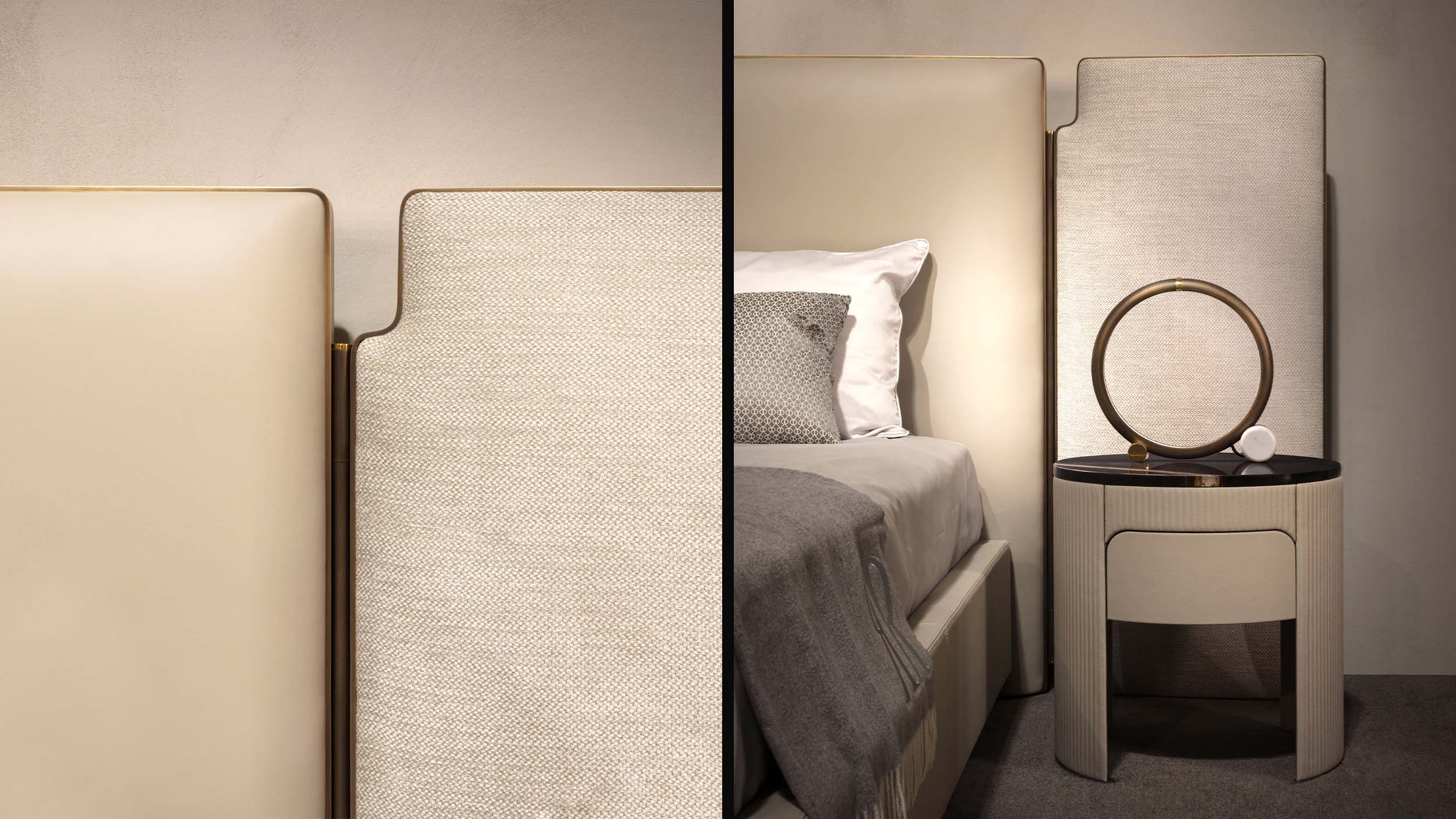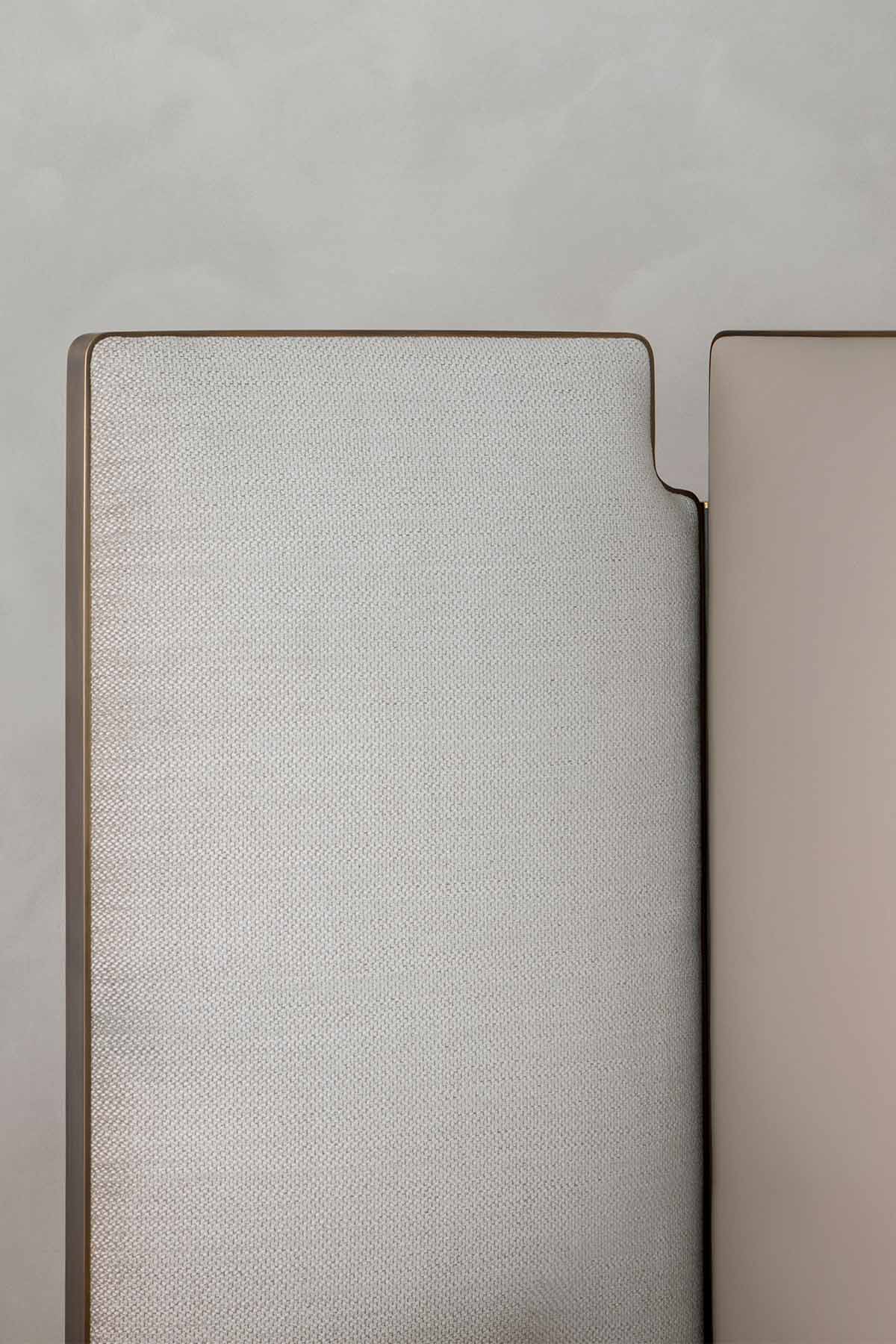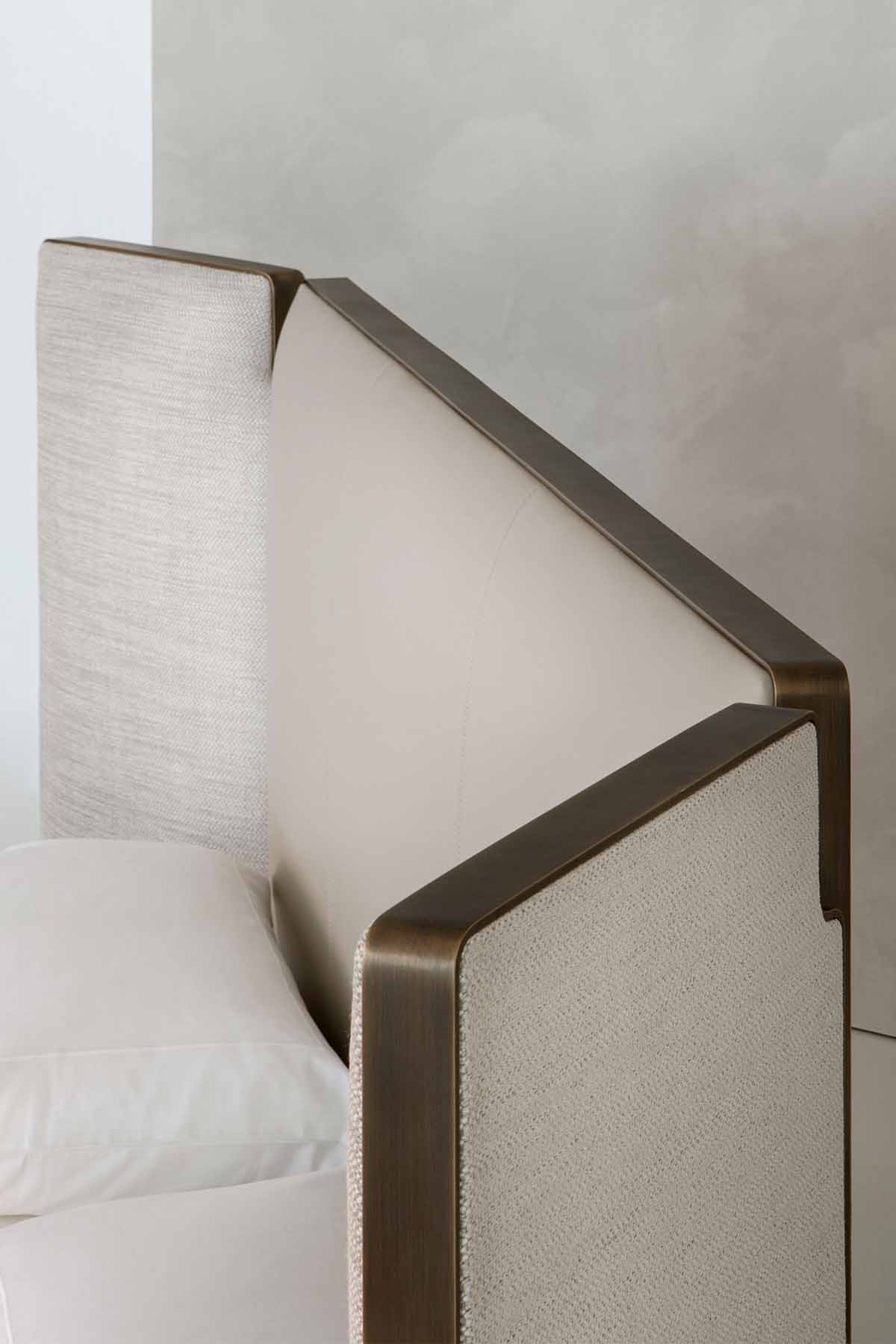 Основание из ткани. Изголовье из ткани . Металлические детали в отделке бронзовая латунь.