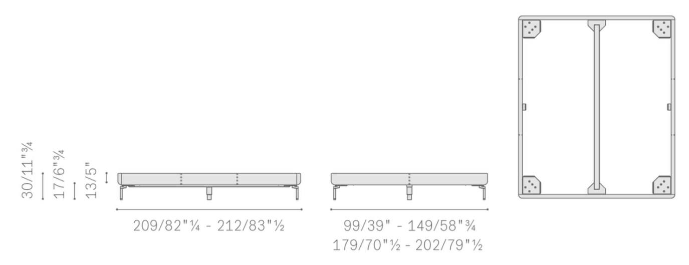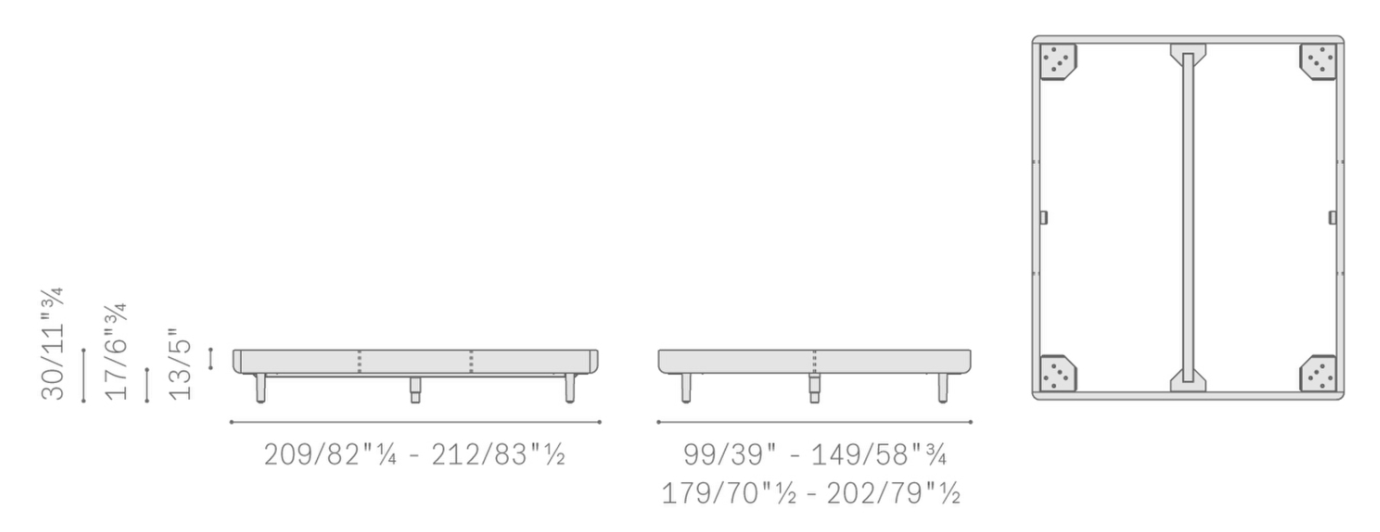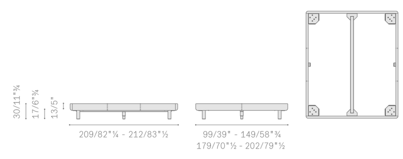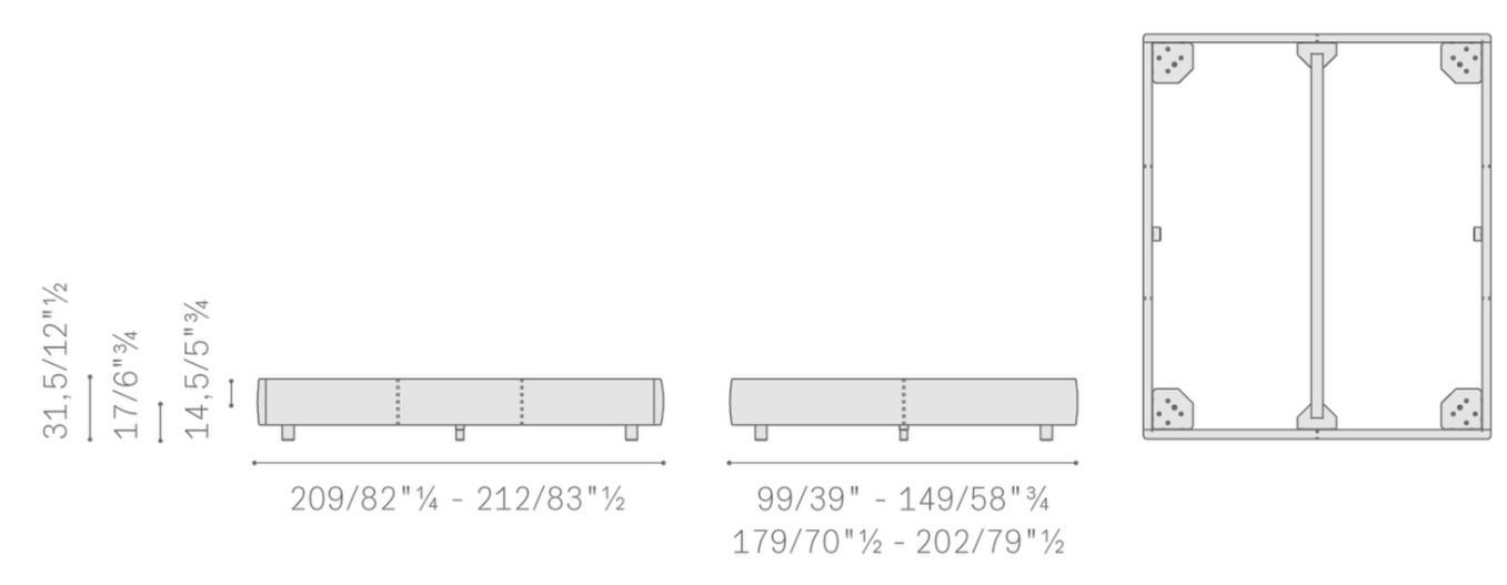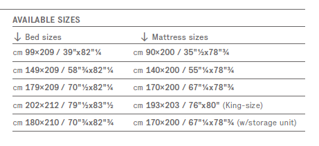 99 х 209 (спальное место 90 х 200). 149 х 209 (140 х 200). 179 х 209 (170 х 200). 202 х 212 (193 х 203).