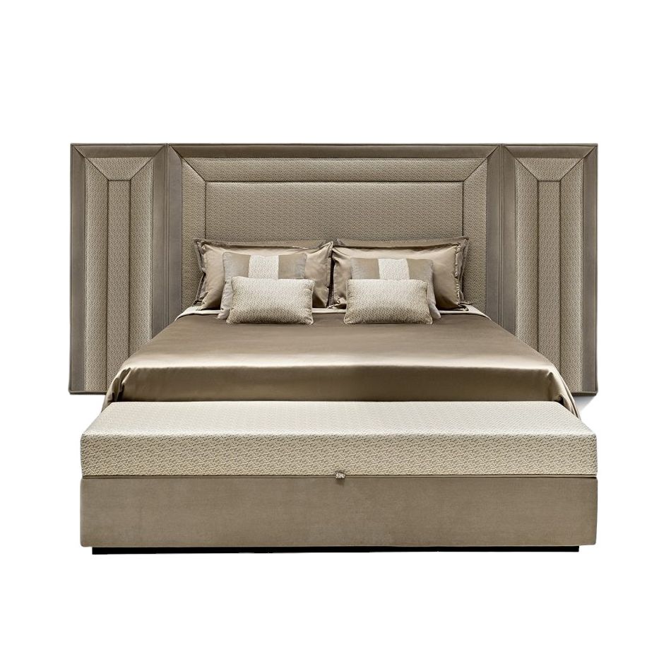 Вариант Big отличается увеличенным изголовьем, состоящим из двух дополнительных панелей, создающих выразительный акцент. В версии Deluxe изысканно сочетаются кожа и текстиль, добавляя интерьеру особый шарм. Основание представлено в элегантной деревянной отделке.