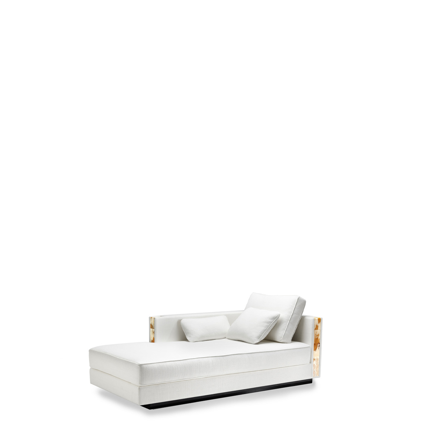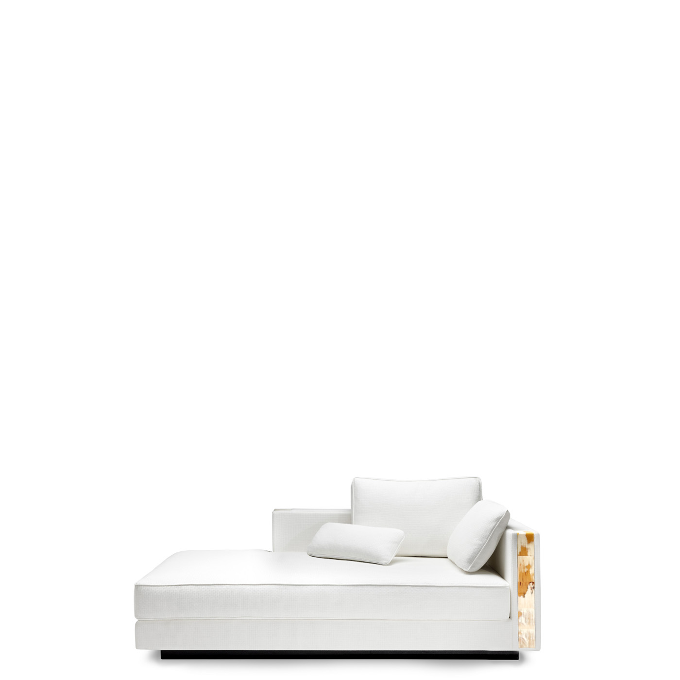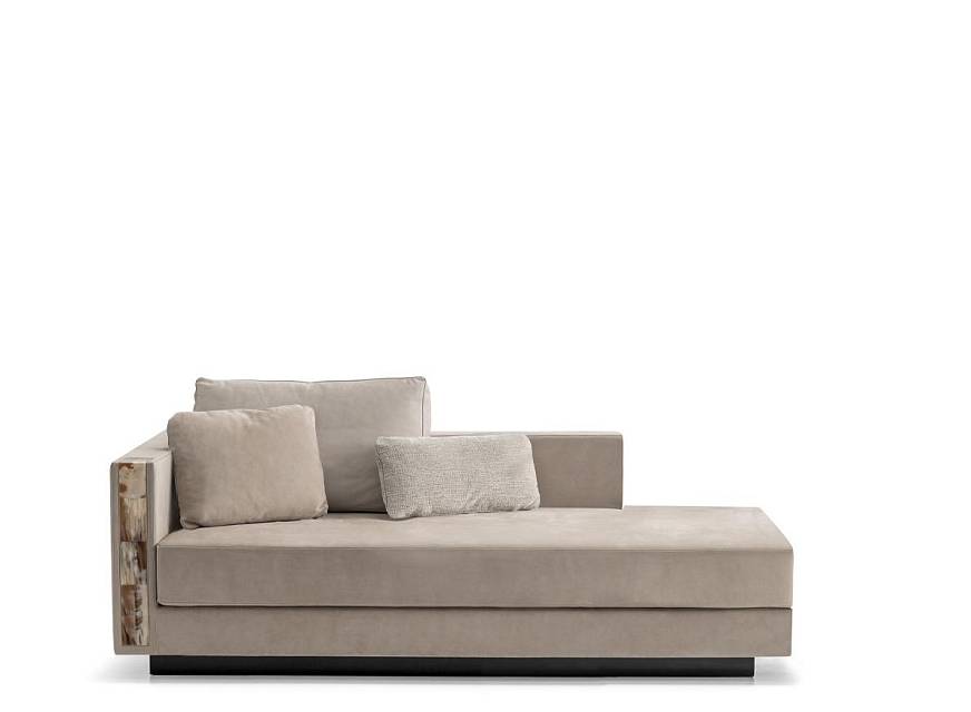 Особенностью Zeus являются вручную выполненные L-образные подлокотники из глянцевого светлого рога, которые придают модели выразительность и уникальный характер. Обивка кушетки может быть адаптирована под индивидуальные предпочтения, предлагая широкий выбор эксклюзивных тканей и материалов.