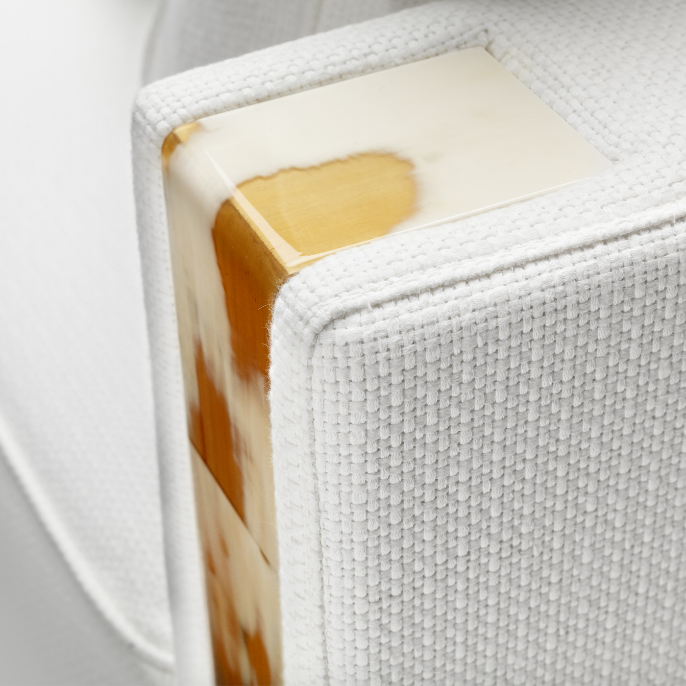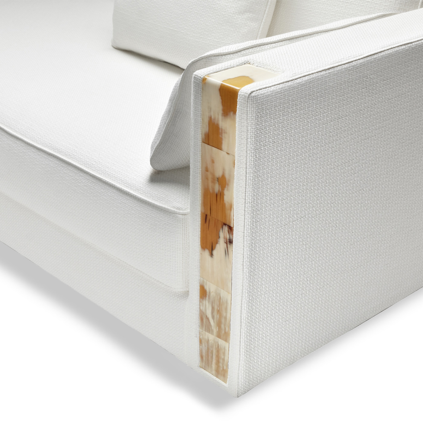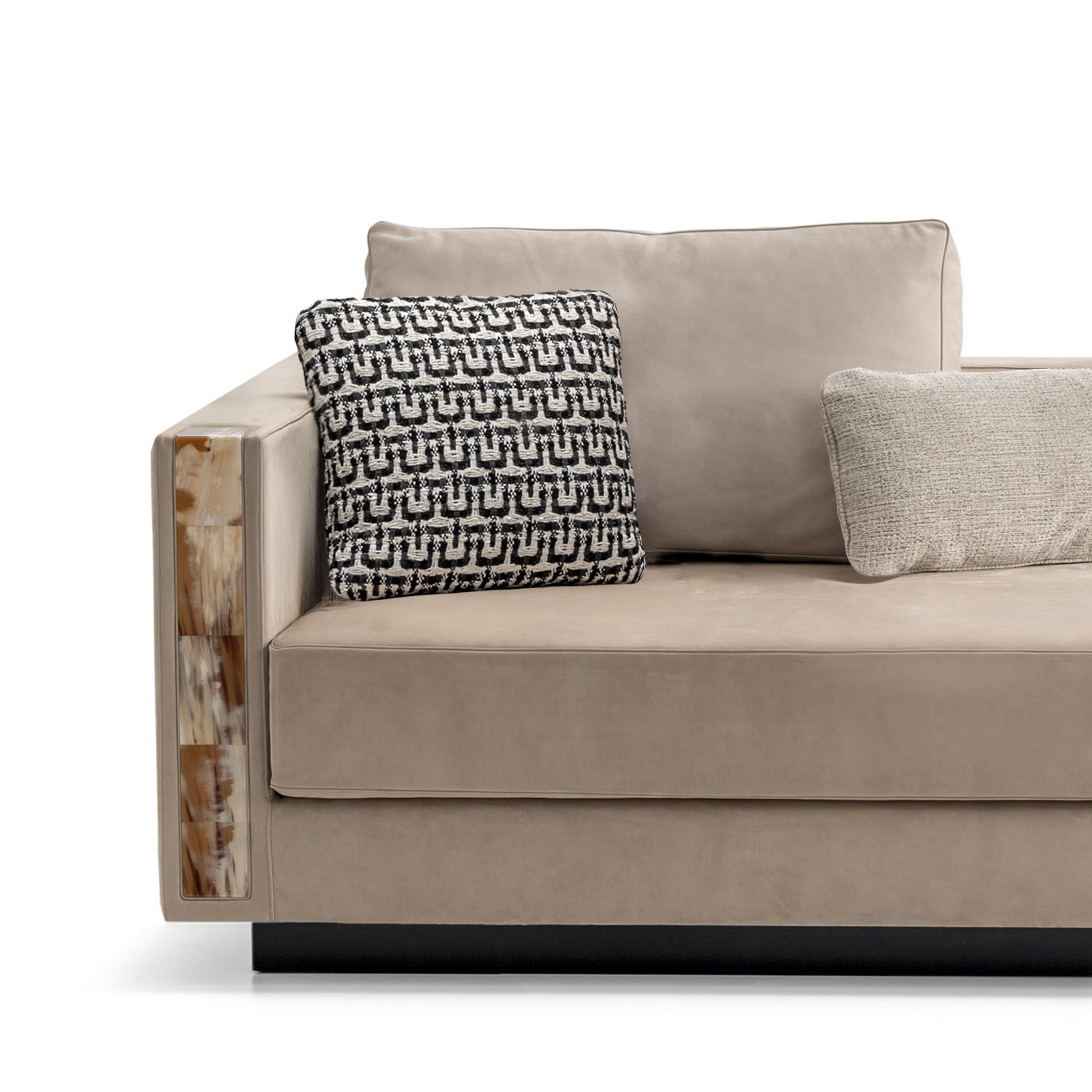 Особенностью Zeus являются вручную выполненные L-образные подлокотники из глянцевого светлого рога, которые придают модели выразительность и уникальный характер. Обивка кушетки может быть адаптирована под индивидуальные предпочтения, предлагая широкий выбор эксклюзивных тканей и материалов.