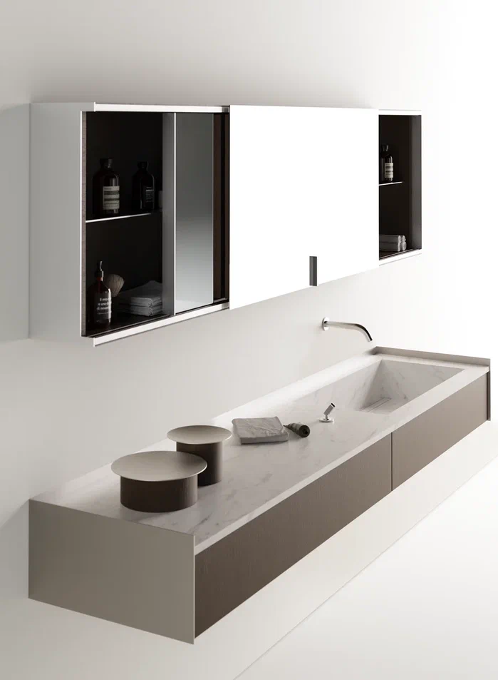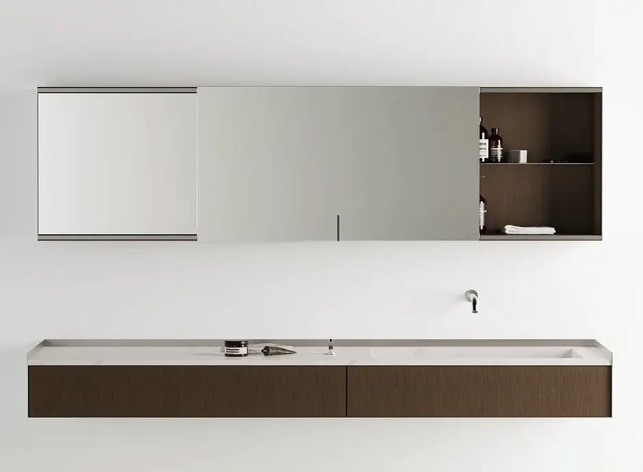 Pаздвижные зеркальные двери позволяют полностью закрыть контейнер, благодаря чему личные предметы и аксессуары становятся невидимыми за элегантной компактностью отражающих поверхностей.
