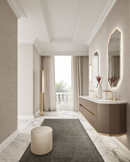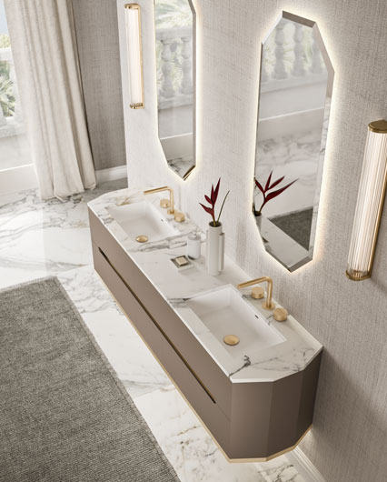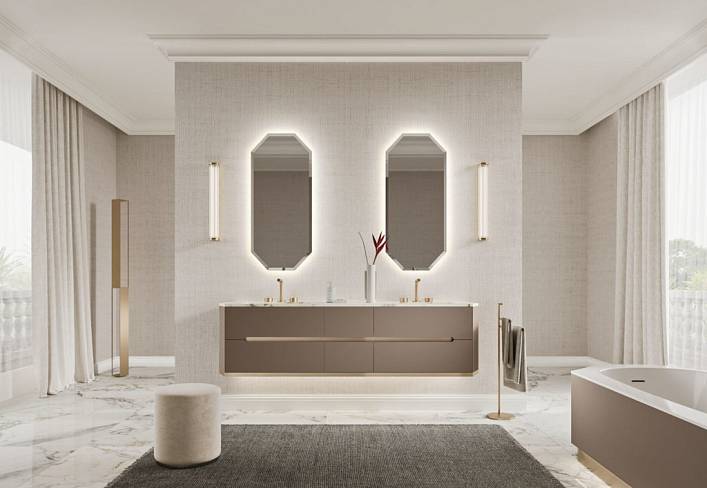 Тумбы и боковые панели в матовом лаке castoro, с фигурным центральным пазом и нижним профилем в сатинированной отделке gold (Ш 195 cm Г 47 cm В 51 (48+3) cm)
