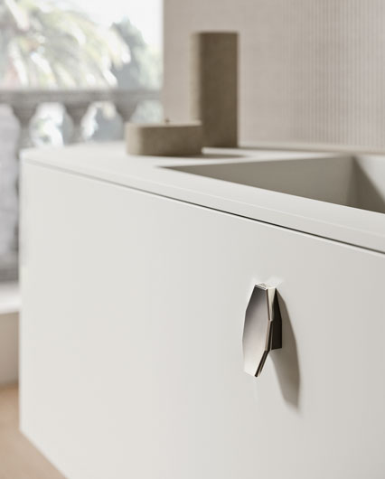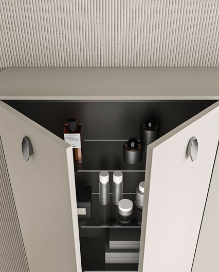 Тумбы, отделка боковин, верхнего и нижнего профиля матовая лакировка «nuvola», ручка хромированная (Ш 141 cm Г 47 cm В 39 (36+3) cm)