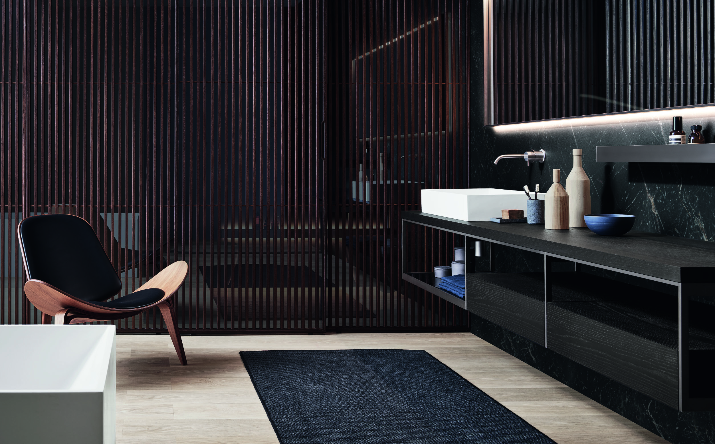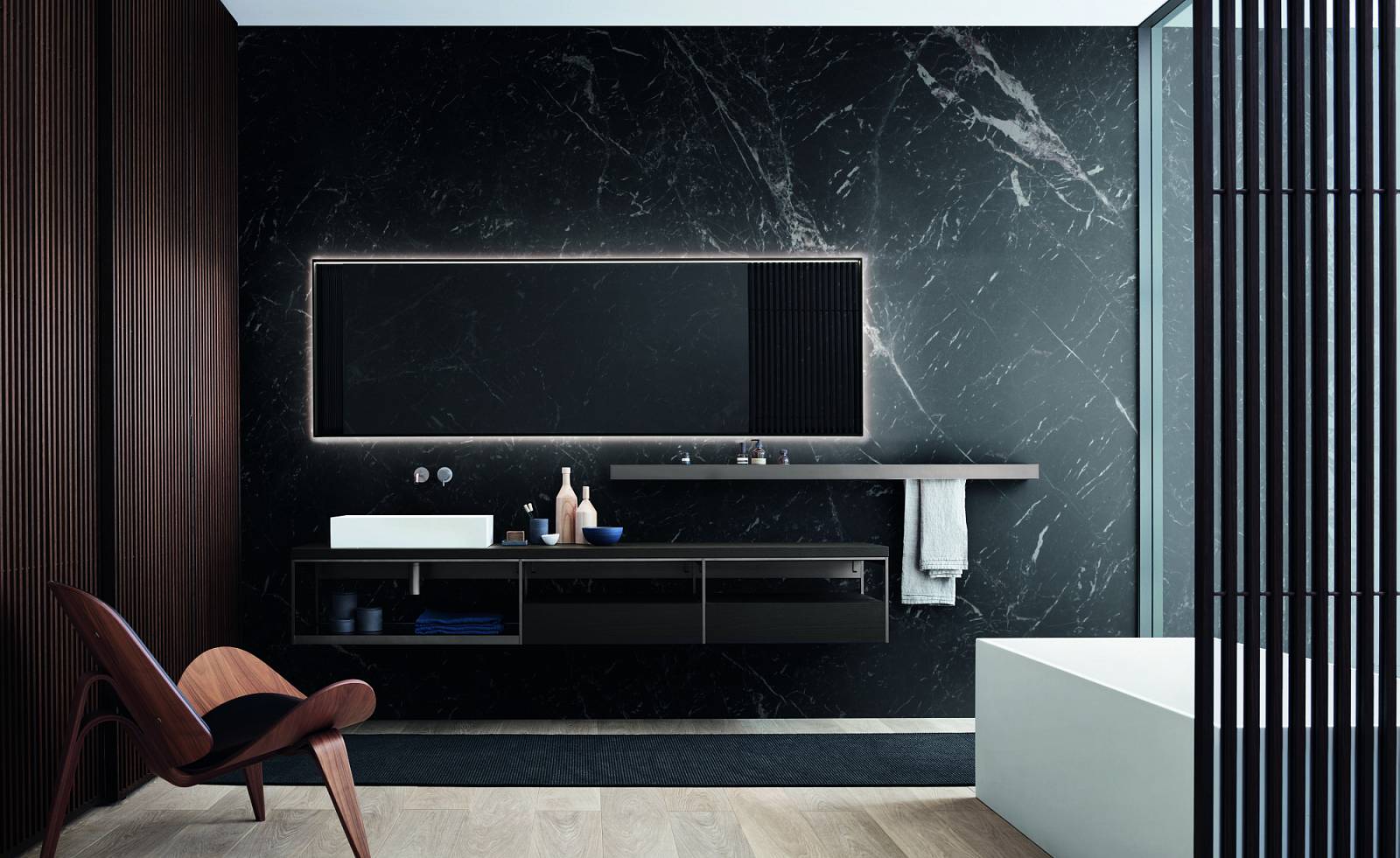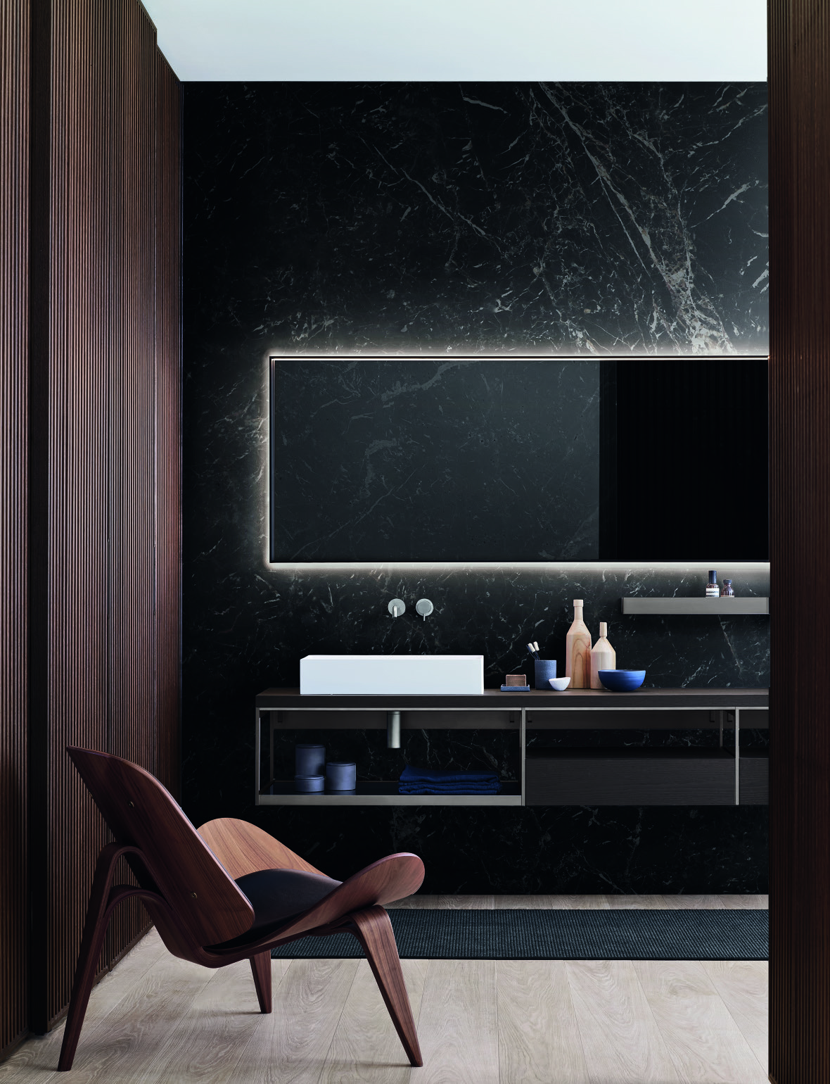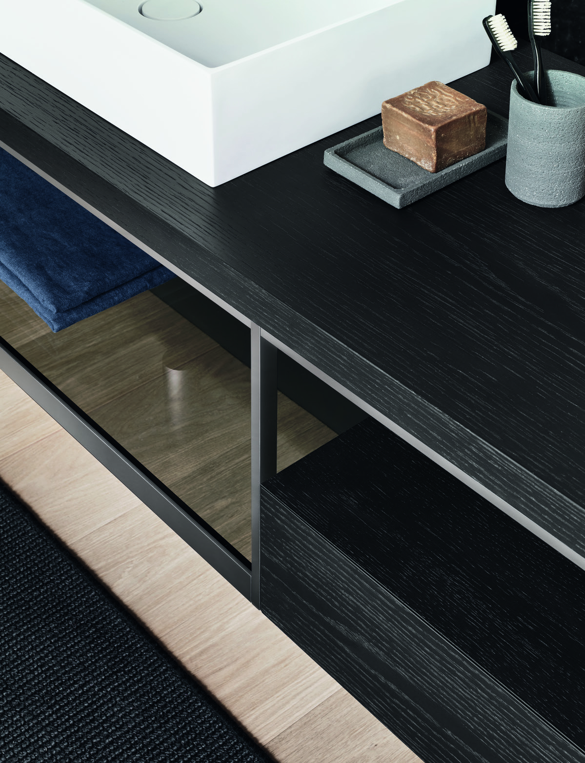 В основе системы – универсальный металлический каркас, который дополняется шпонированными основаниями, открытыми модулями, комодами, полками, столешницами для моек, зеркалами и настенными полками. Выбрав Fjord, вы можете комбинировать элементы, создавая гармоничные композиции в разных стилях. Богатый выбор эксклюзивных отделок – металл, камень, стекло, шпон и лаки – позволяет реализовать любую дизайнерскую задумку.