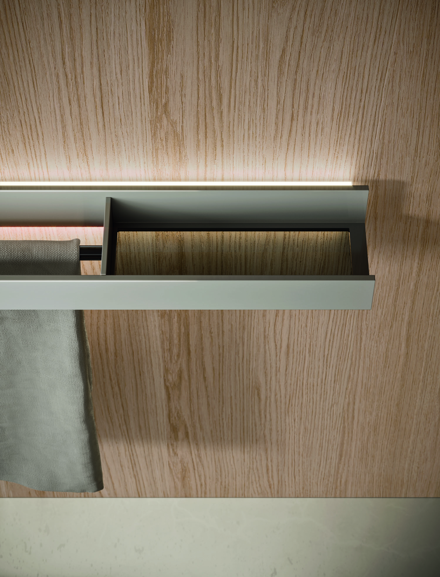 Внутренняя организация ящиков – система Share в цвете Rovere Carbone.