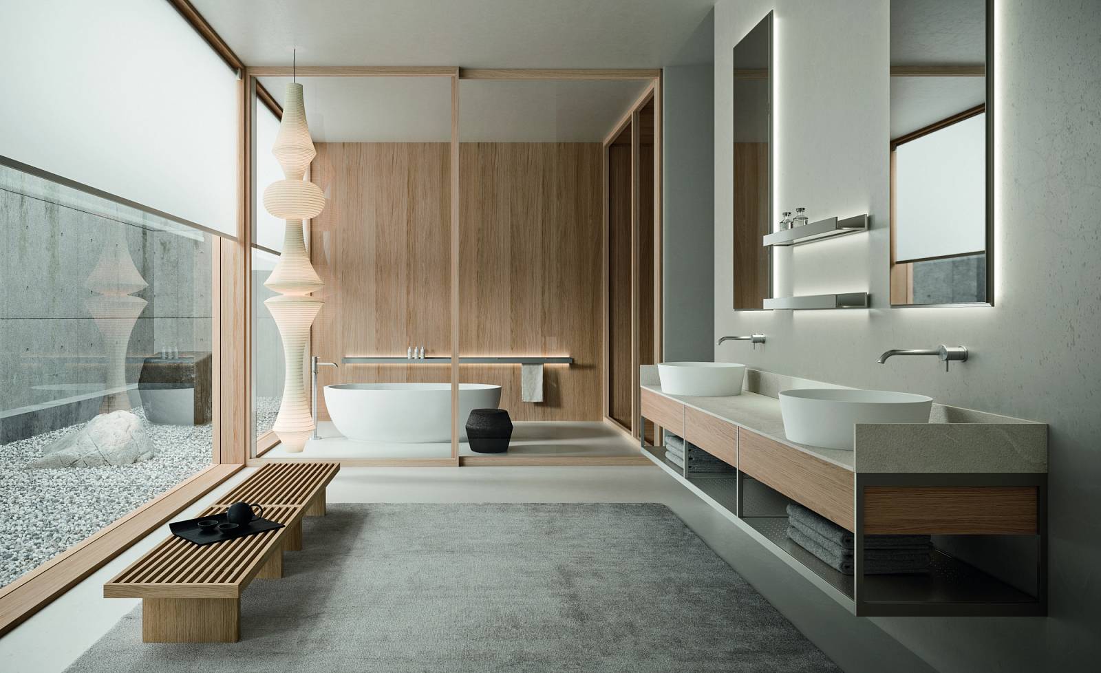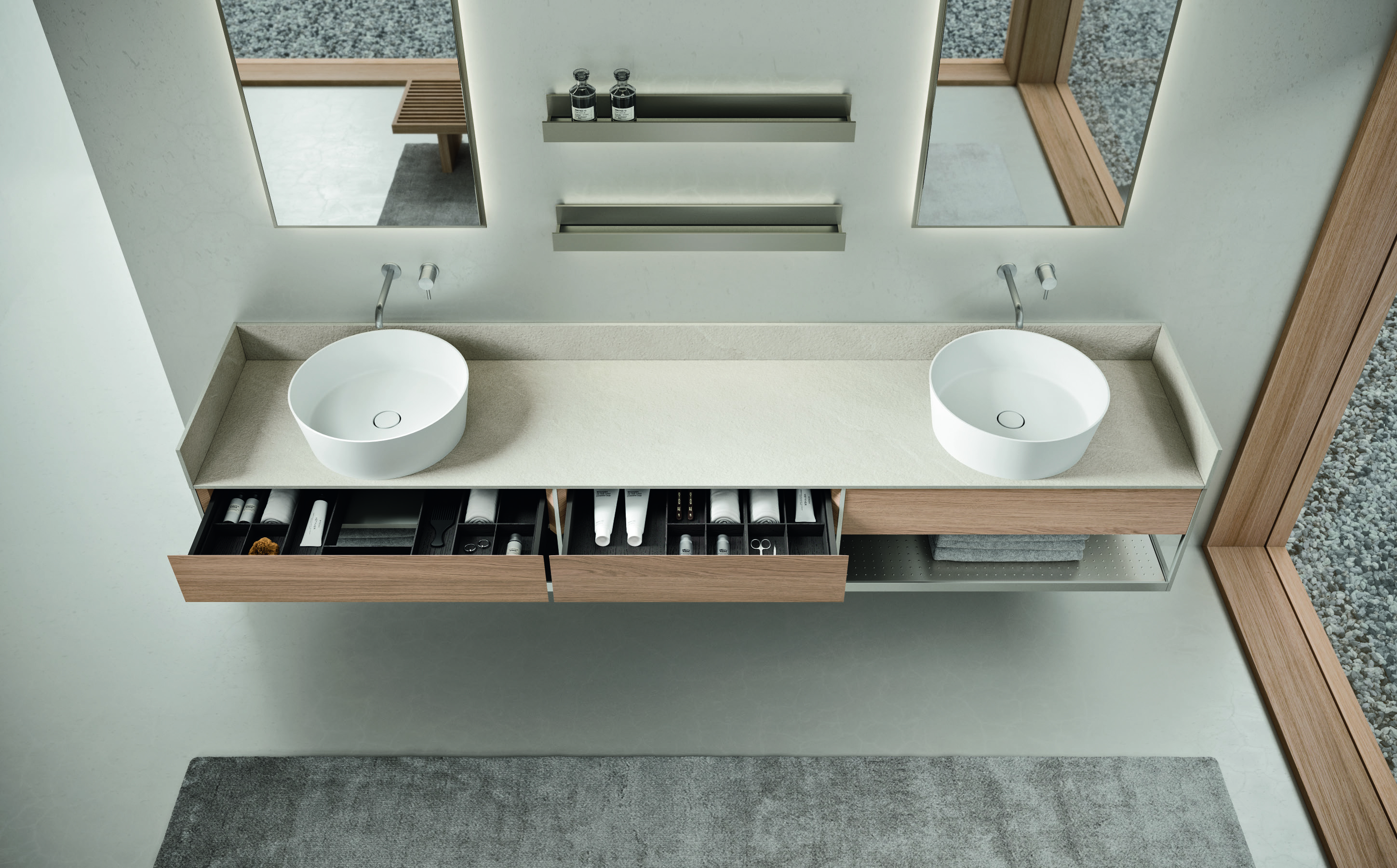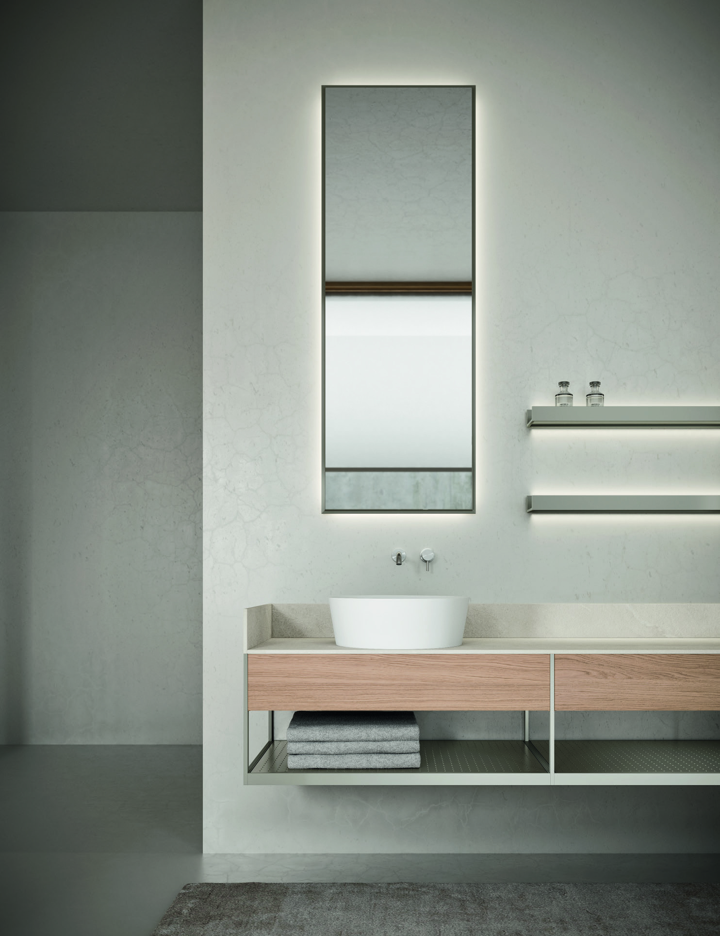 В основе системы – универсальный металлический каркас, который дополняется шпонированными основаниями, открытыми модулями, комодами, полками, столешницами для моек, зеркалами и настенными полками. Выбрав Fjord, вы можете комбинировать элементы, создавая гармоничные композиции в разных стилях. Богатый выбор эксклюзивных отделок – металл, камень, стекло, шпон и лаки – позволяет реализовать любую дизайнерскую задумку.