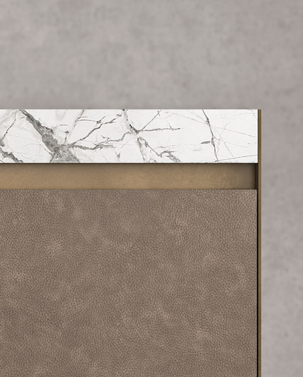 Тумбы с верхним пазом, фасады в коже nabuk nevada и крашеные боковины в отделке ottone nuvolato ( 180,8 cm Г 55,5 cm В 36 cm).