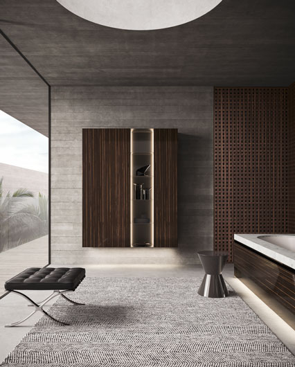 Пеналы с фасадами из глянцевого черного дерева, открытое отделение с покрытием глянцевого металлизированного лака Vulcano (Ш 144,8 cm Г 33 cm В 180 cm).