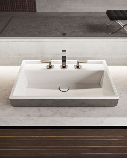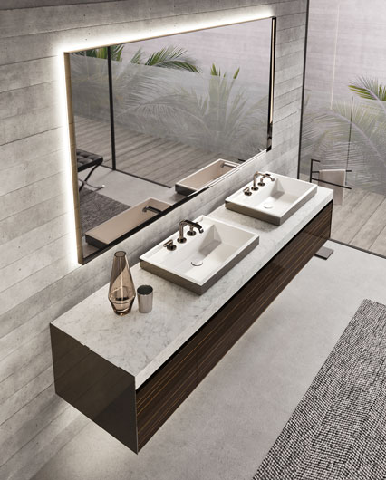 Столешница из белого каррарского мрамора с накладными раковинами Detroit 62 из черной хромированной стали (Ш 225,8 cm Г 55,6 cm В 7 cm).