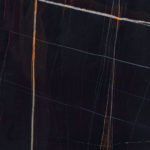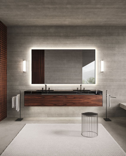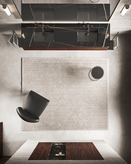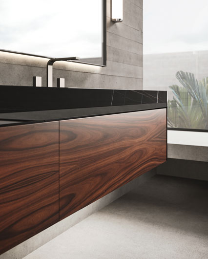 Столешница из полированного мрамора Sahara noir (Ш 216,8 cm Г 55,6 cm B 7 cm) с встроенными раковинами Panama 54 из полированной черной керамики (Ш 52,5 cm Г 32,5 cm Г 12,5 cm).