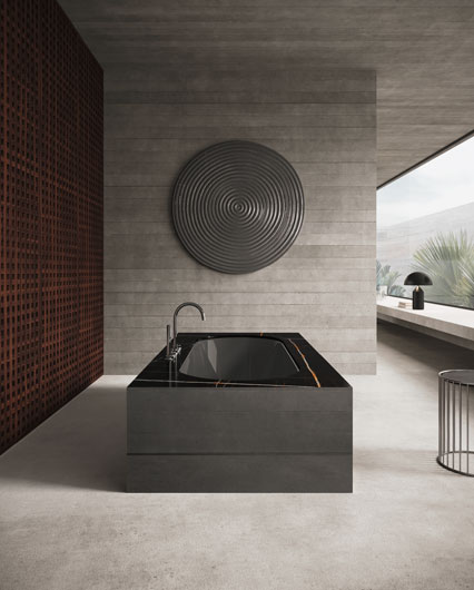 Встраиваемая ванна San Diego со светодиодной подсветкой, матовой облицовкой из палисандра, глянцевым металлизированным лаком vulcano и топом из полированного мрамора Sahara noir (Ш 200,5 cm Г 100,5 cm В 58,7 cm).